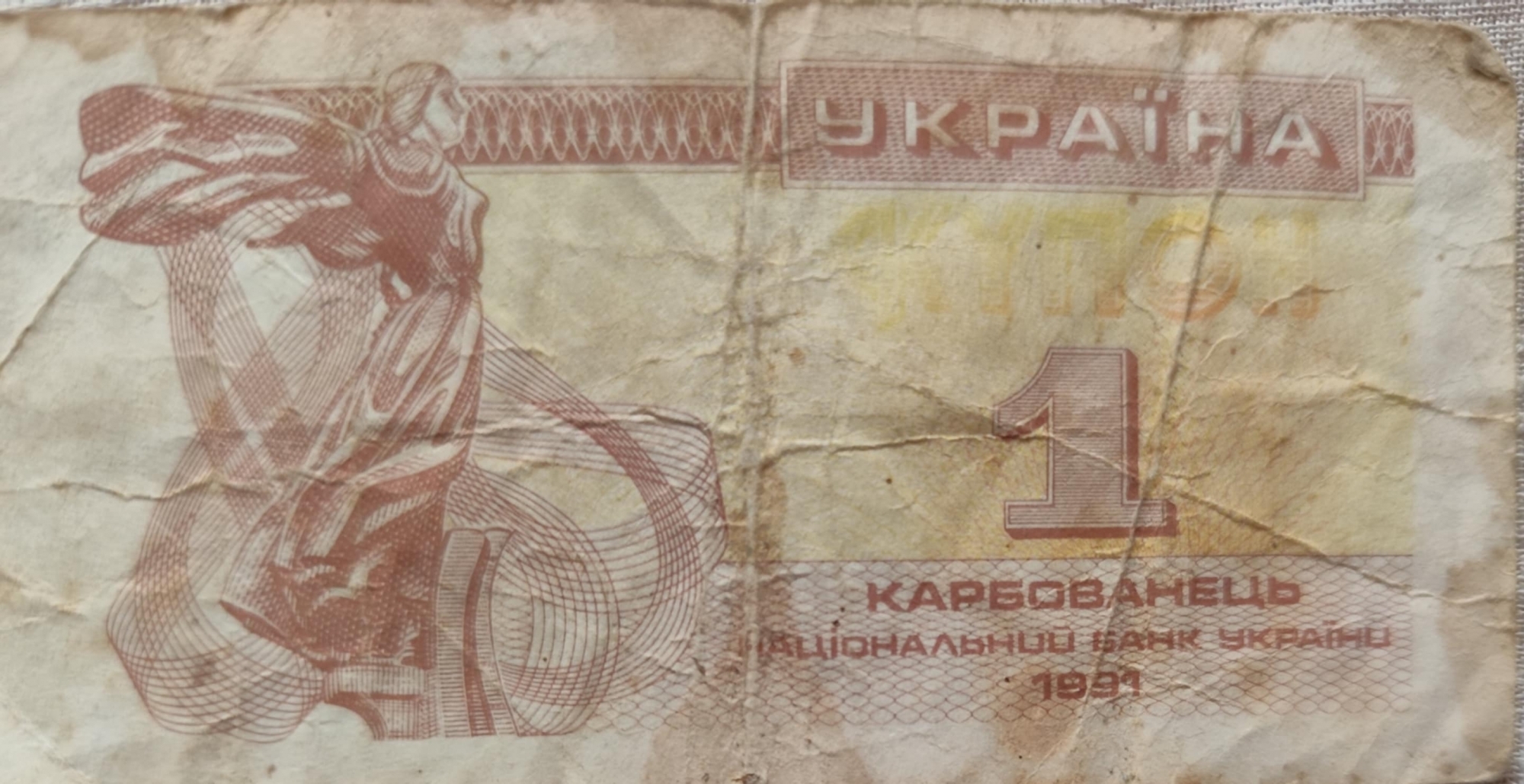 Bancnota de formă dreptunghiulară are valoarea nominală de 1 karbovanets (cupoane) din Ucraina are culori predominant maroniu-roșiatic și alb murdar. Pe avers valoarea este scrisă atât cu cifre ("1"), cât și cu text ("КАРБОВАНЕЦЬ"). Numele țării apare în partea de sus, cu caractere chirilice: "УКРАЇНА". Numele băncii este scris sub valoarea nominală: "НАЦІОНАЛЬНИЙ БАНК УКРАЇНИ". Anul emiterii 1991 este menționat în partea de jos, la baza bancnotei. În partea stângă, este prezentată o figură alegorică (probabil o femeie) într-o mișcare dinamică, cu o eșarfă sau o pânză care flutură în vânt.