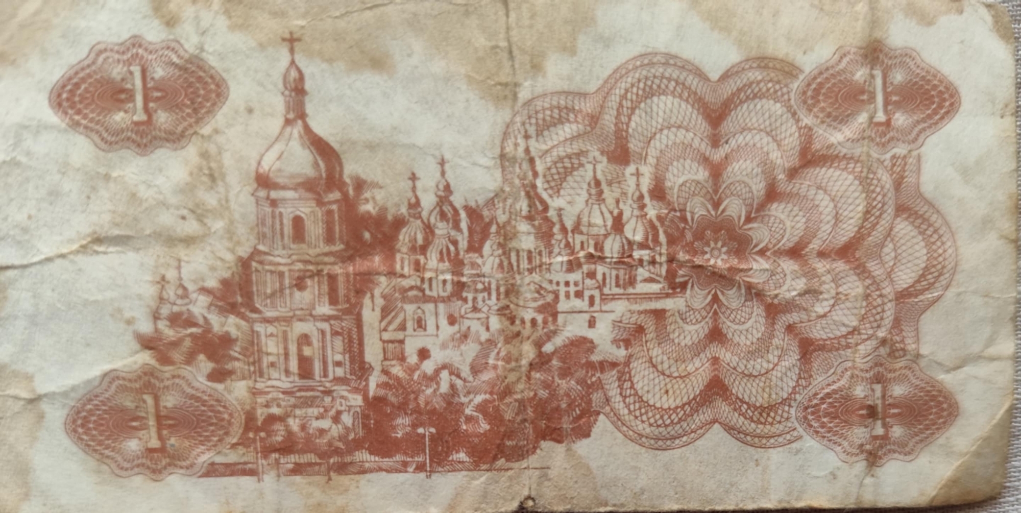 Pe revers , pe fiecare colț al bancnotei se poate vedea cifra "1" într-un desen ornamental. pe centru bancnotei este imaginea unei clădiri grandioase- Marea Lavră a Mănăstirii Peșterilor din Kiev (Kyiv Pechersk Lavra), cu mai multe cupole, una centrală mai mare și altele mai mici. Arhitectura sugerează o origine est-europeană, posibil ucraineană sau rusească. Bancnota are un design complex, cu motive florale sau ornamentale elaborate pe partea dreaptă, care se extind și spre centru. Culoarea dominantă este un roșu-maroniu.