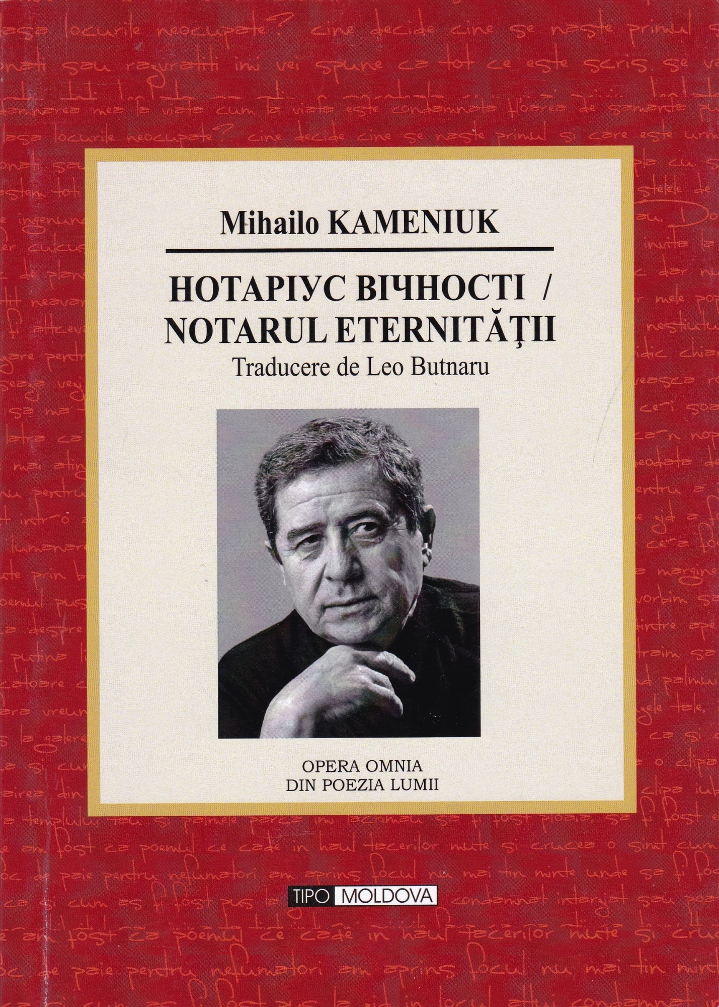 Нотарiус вiчностi/ Notarul eternității o lucrare de poezie scrisă de Mihailo Kamenjuk și tradusă în limba română de Leo Butnaru. Cartea face parte din colecția "Opera Omnia din Poezia Lumii", publicată de editura TIPO Moldova. Cartea reunește poeme care explorează teme precum timpul, memoria, destinul și condiția umană, îmbinând sensibilitatea lirică cu reflecții filozofice. Printr-un limbaj bogat și imagini poetice puternice, autorul caută să surprindă esența eternității și rolul poetului ca martor și „notar” al existenței. Coperta prezintă un fundal roșu cu text scris de mână într-o nuanță mai deschisă, încadrat de o margine aurie în jurul secțiunii centrale. În partea de sus, este afișat numele autorului, urmat de titlul cărții în ucraineană și traducerea sa în română. Sub titlu este specificat „Traducere de Leo Butnaru”, indicând traducătorul. Partea centrală conține o fotografie alb-negru a unei persoane într-o ipostază gânditoare. În partea de jos apare textul „OPERA OMNIA DIN POEZIA LUMII”, alături de logo-ul editurii.