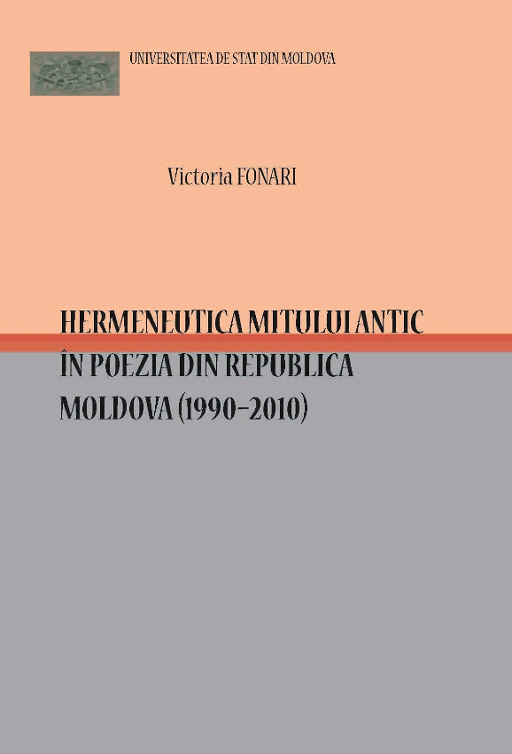 „Hermeneutica mitului antic în poezia din Republica Moldova (1990-2010)” de Victoria Fonari este o lucrare academică ce analizează modul în care miturile antice sunt reinterpretate și integrate în poezia contemporană din Republica Moldova. Autoarea explorează impactul mitologiilor grecești și romane asupra poeziei post-sovietice, arătând cum autorii din această perioadă le folosesc pentru a exprima teme universale precum identitatea, libertatea, conflictul între tradiție și modernitate. Fonari abordează tehnicile hermeneutice de interpretare a miturilor, evidențiind cum aceste simboluri și figuri mitologice sunt refuncționalizate în contextul cultural și istoric al Moldovei postcomuniste. Coperta este împărțită în două zone de culoare: partea superioară este portocaliu-deschis, iar partea inferioară este gri. În partea de sus, în stânga, apare sigla Universității de Stat din Moldova, urmată de numele autoarei. Titlul lucrării, scris cu majuscule, evidențiat printr-o linie orizontală roșie care separă titlul de restul coperții.