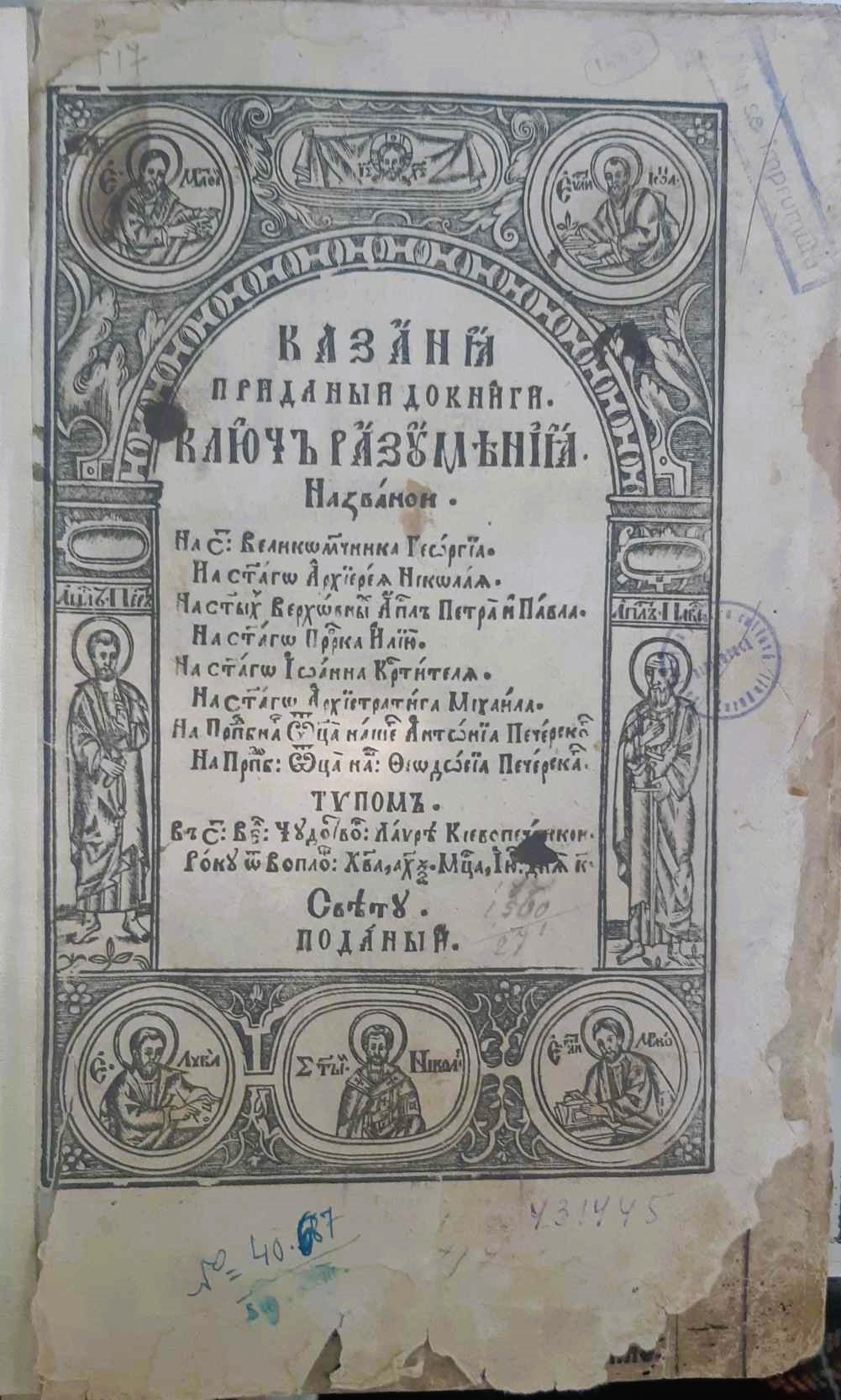 Казанья, приданные до книги Ключ Разумения названой. Тѵпомъ въ с(вятой) Ве(лико) Чудо(т)во(рной)> Лаvрѣ Кiевопечерскои. Року о(т) Вопло(щения)> Х(ристо)ва, ах҃ѯ (1660). М(еся)ца, Iюб> дня к҃ Свѣту поданый.. 402 file. 24 rânduri. Text în ramă liniară.