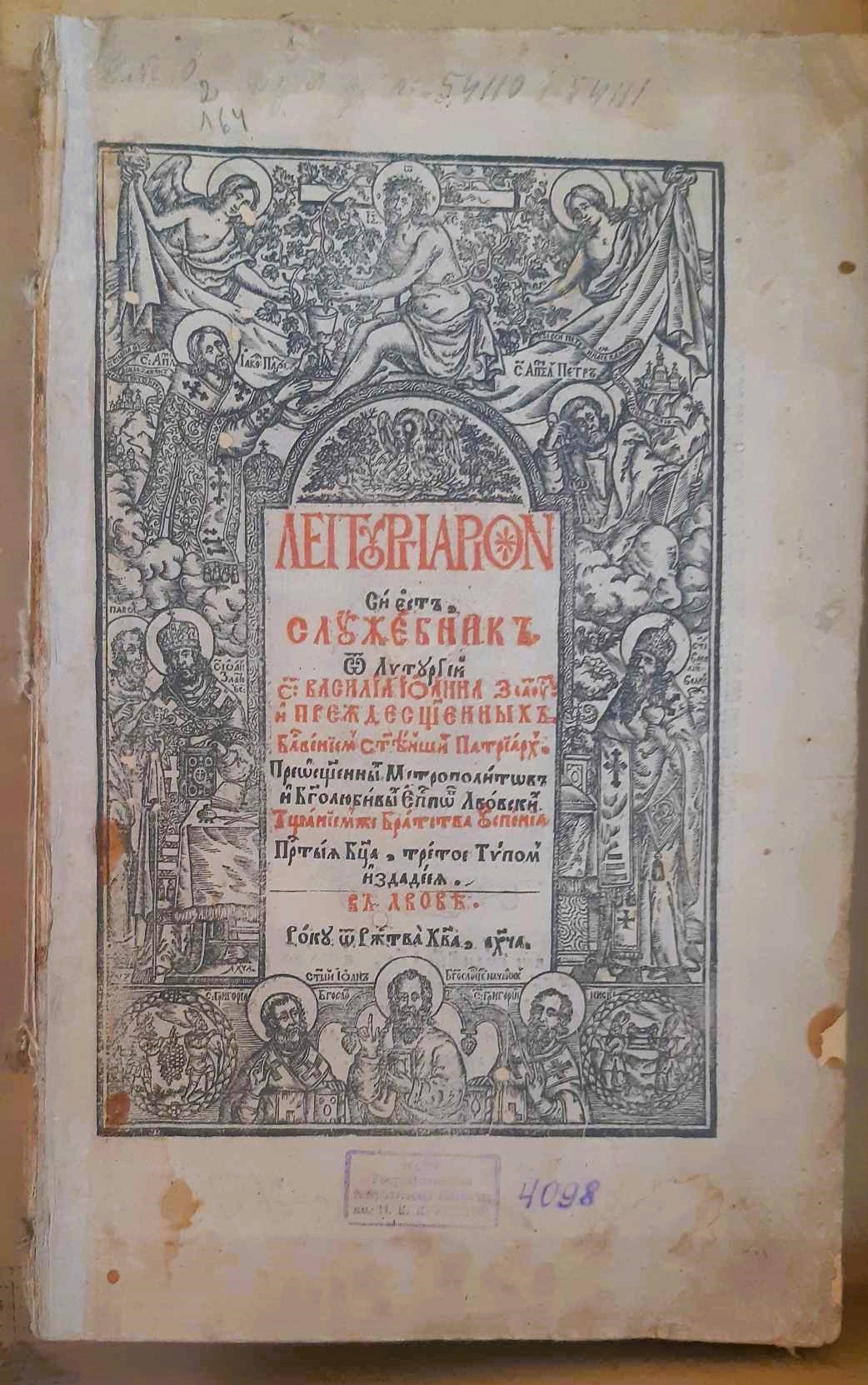 Леітургіаріон, си єст Служебник от литургій святаго Василіа, Іоанна Златоустаго и преждесвященных. Львов: Типография братства, [типограф Симеон Ставницкий], Року о(т) Р(о)ж(дес)тва Х(ристо)ва, 1691