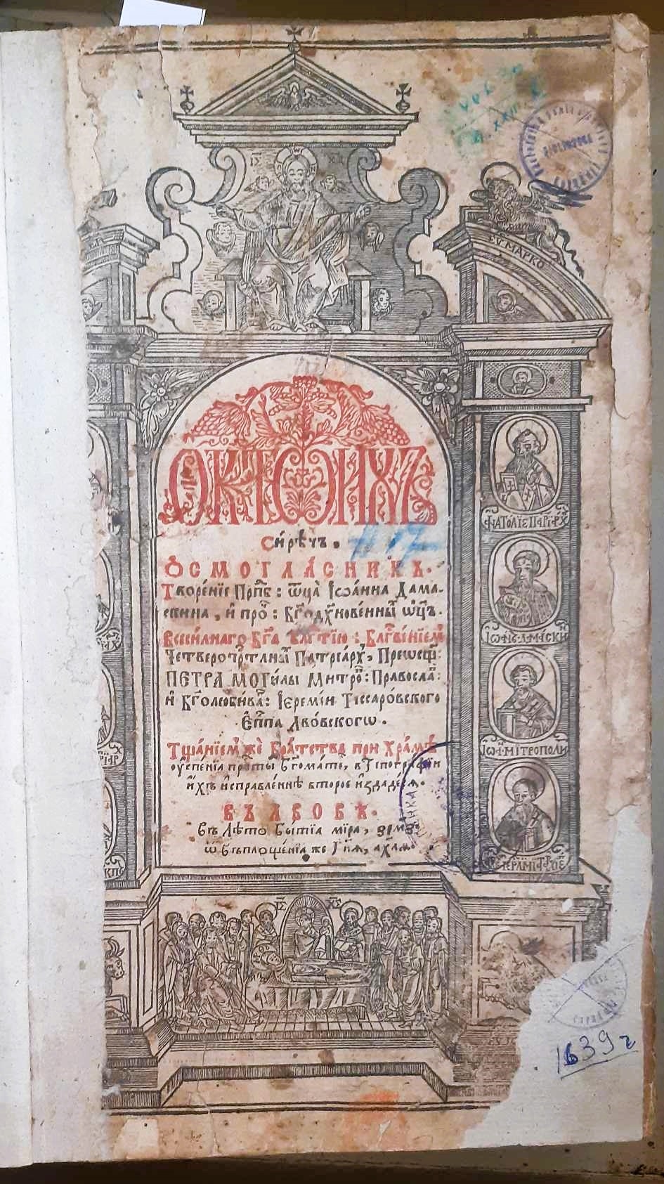 Октоих сиречь осмогласник. Львов: Тщанием же Братства при Храме Оуспения Пря(се)той Б(о)гомате(ри) , В(ъ) лето бытия мира 7147. О(т) в(о)плошения же Г(ос)п(од)а 1639