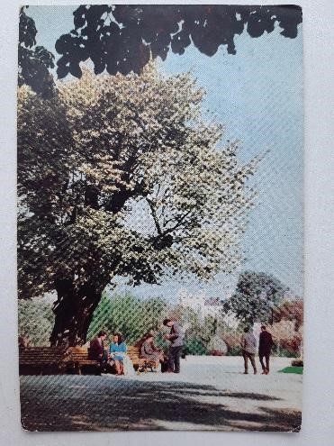 Cartea poștală circulată, color, care redă o imagine cu Teiul lui M.Eminescu din grădina Copou, Iași.