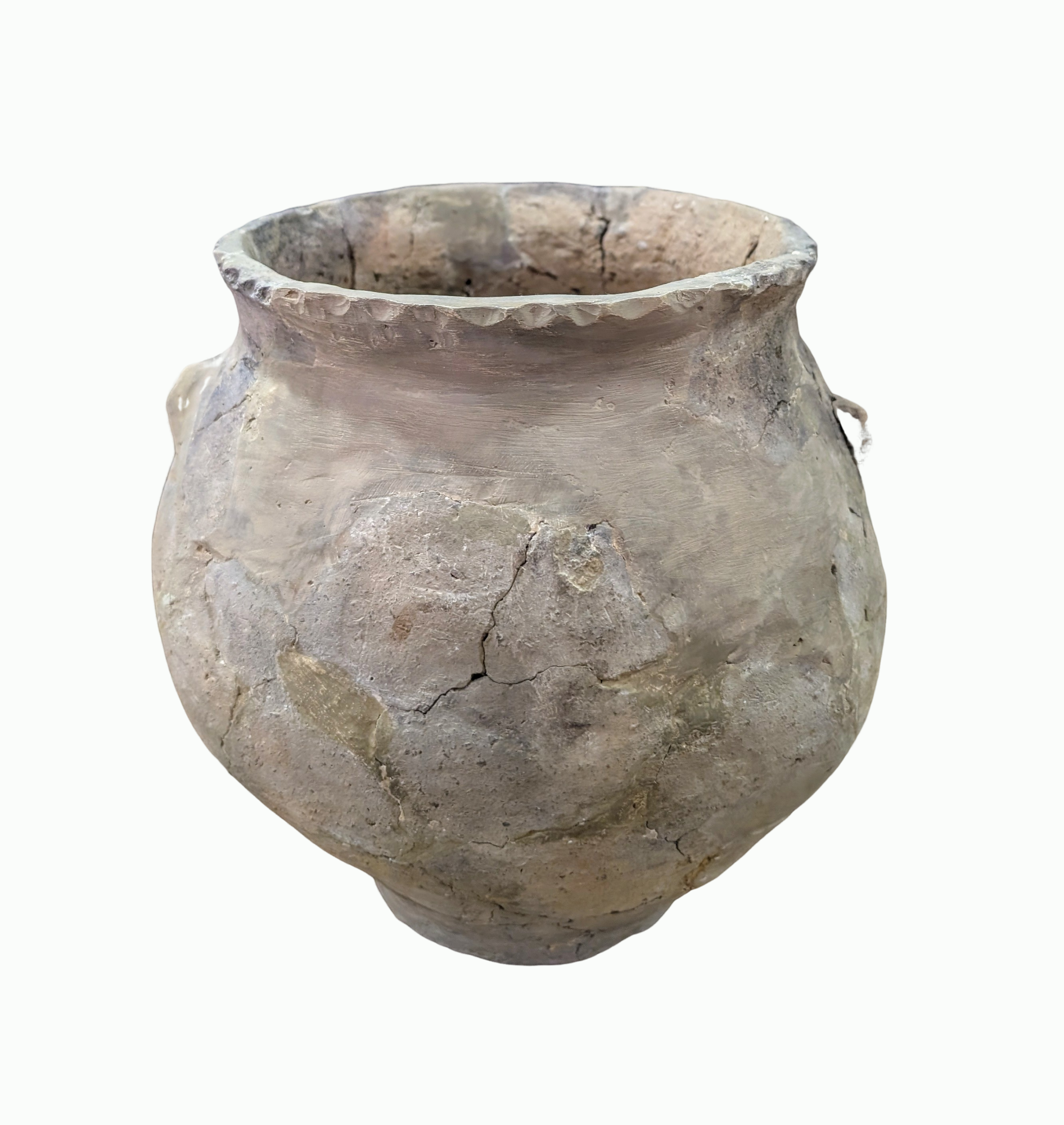 Vas ceramic din perioada Fierului. Buza evazivă ieșită spre exterior și fundul îngust. Vasul are două torți laterale.