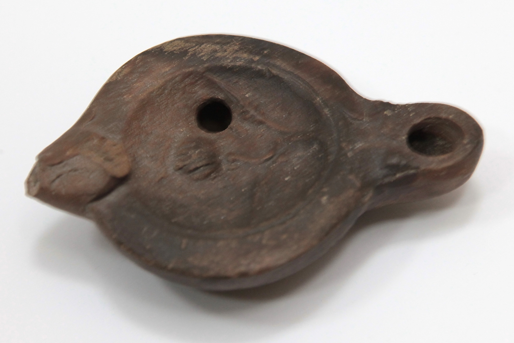 Lampă cu corp de disc, prevăzut cu un rezervor închis, de mică adîncime, avînd în zona ciocului și ex-centric spre stînga cîte un orificiu. Decorul de la suprafața vasului prezintă linii și un motiv floral tratat în relief.