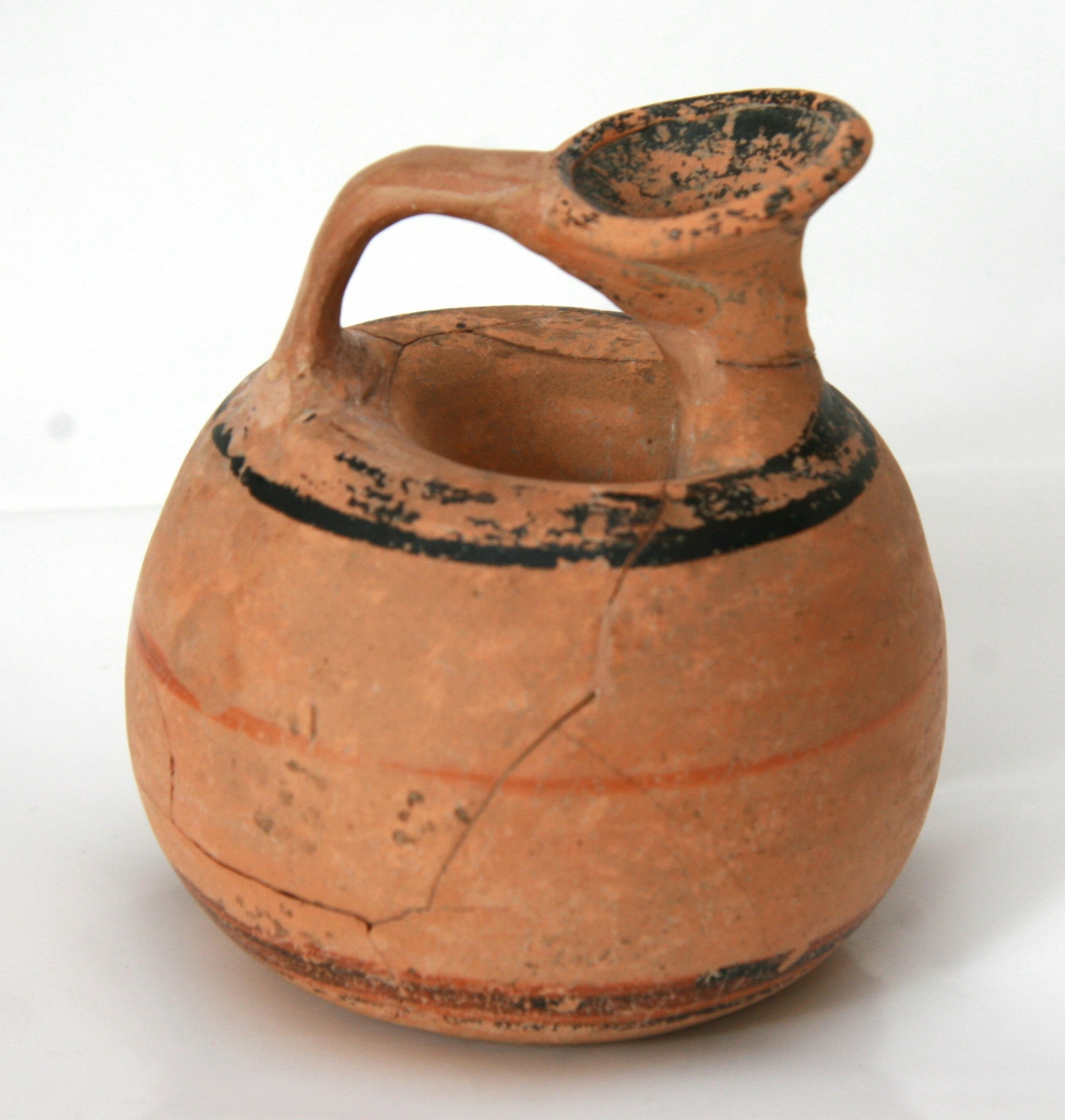 Vas antic de formă globulară, prevăzut cu un orificiu transversal, cu gît scurt tubular, buză evazată și un mîner plasat oblic, de pe corp spre gîtul acestuia. Decorul de pe suprafața vasului este constituit din benzi și linii, negre și brun-roșiatice, dispuse orizontal în registre.