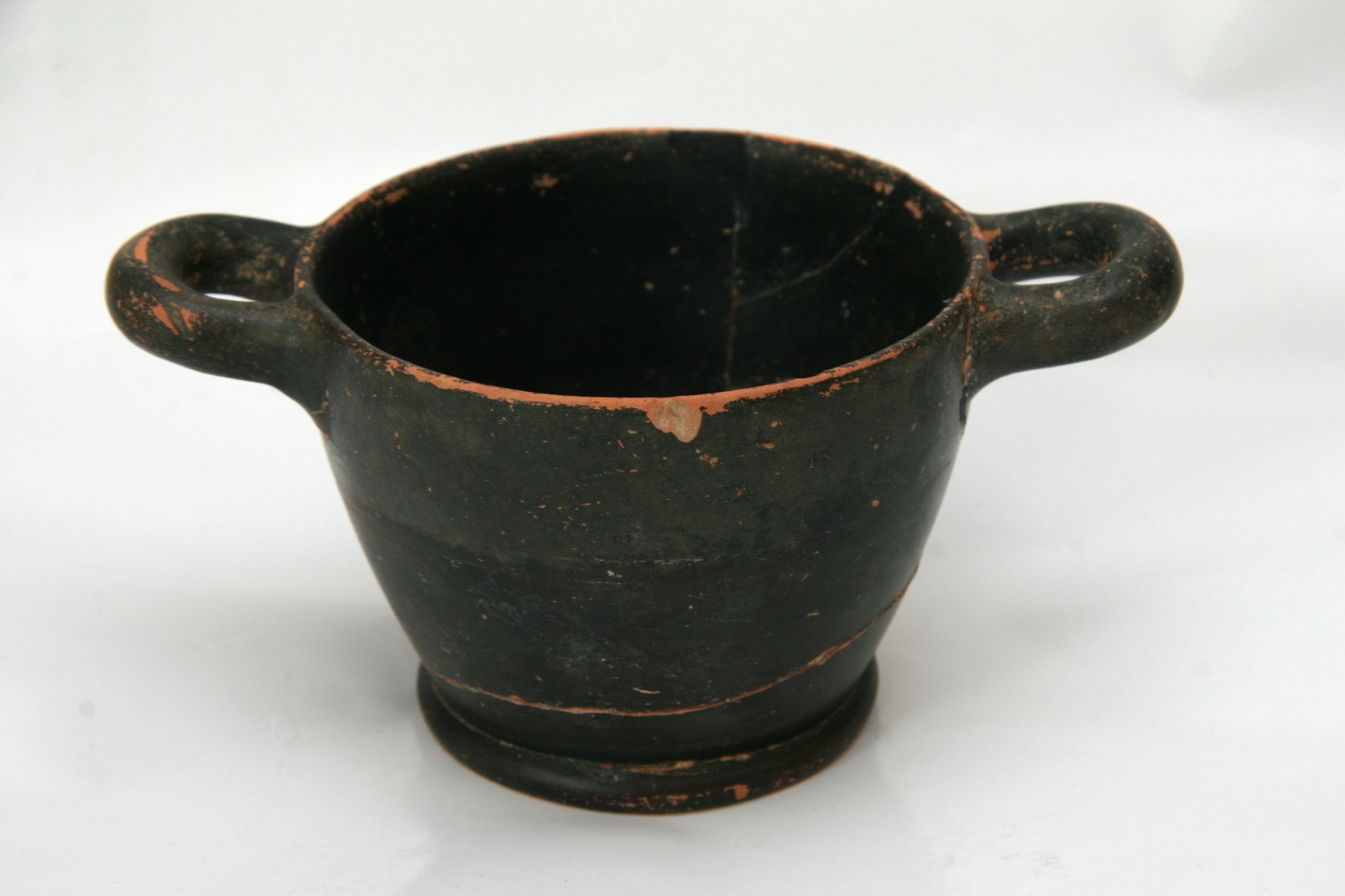 Vas antic, de forma unei cupe adînci, cu gură mare, deschisă în exterior, prevăzut cu două mînere proiectate și extinse orizontal, se sprijină pe o bază circulară. Suprafața vasului fară decor este acoperită în întregime cu glazură neagră.
