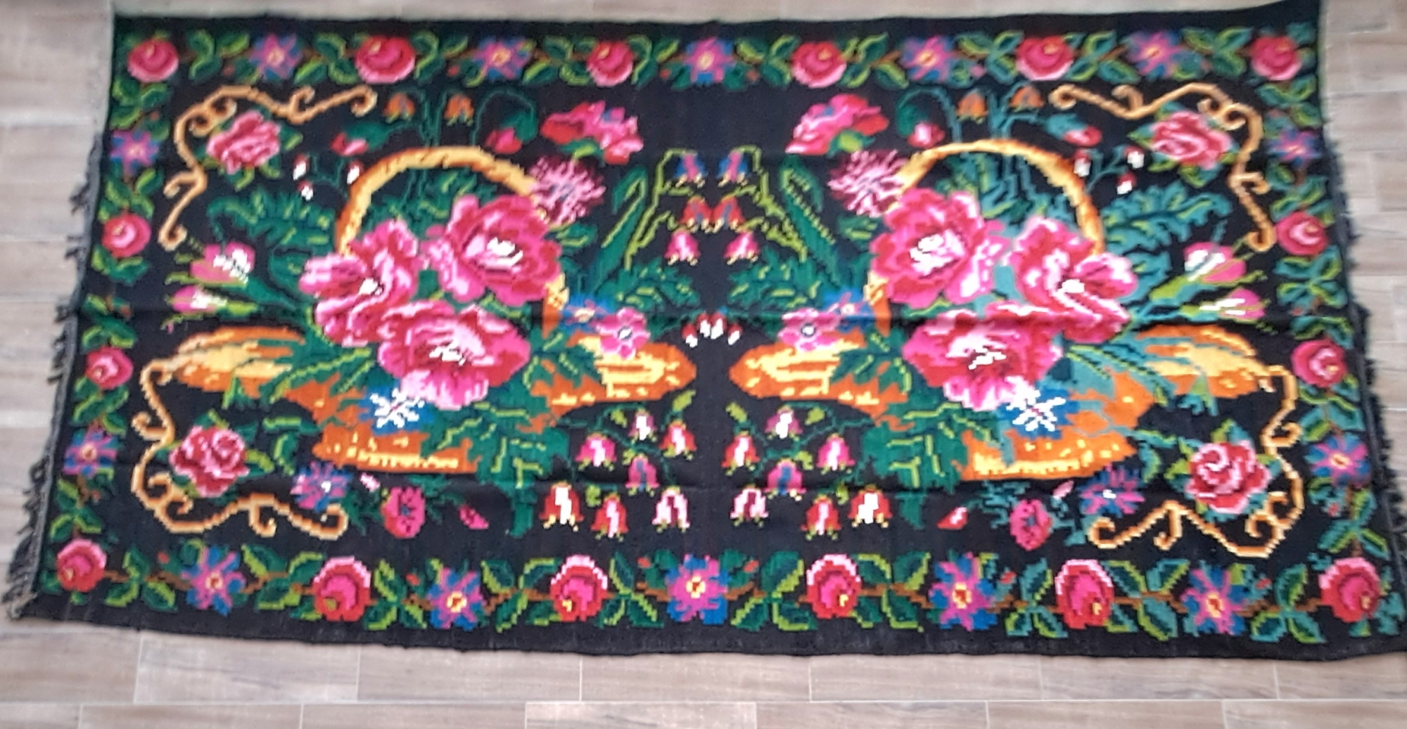 Piesă de formă dreptunghiulară, țesut manual la războiul de țesut vertical pe urzeală de bumbac răsucit, de culoare neagră, bătut cu lână. Câmp negru, ornament cu motive florale. Două coșuri cu flori, înconjurate de un chenar bine conturat cu motive florale. Cromatică; negru, nuanțe de verde, roș, roz, oranj, galben, violet, albastru.