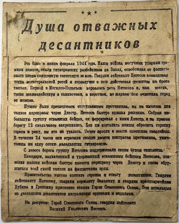 Articol "Sufletul parașutiștilor viteji”, în care se relateză despre perioada celui de-al Doilea Război Mondial, sfârșitul lunii februarie 1944, precum că locotenetul Netesov , cooperând cu echipajele de tancuri și având sub conducere unitatea militară de pușcași, a eliberat pămntul Mogilev-Podolsk de naziști (germani). Se menționează despre curajul și eroismul soldaților viteji sub comanda lui Netesov.