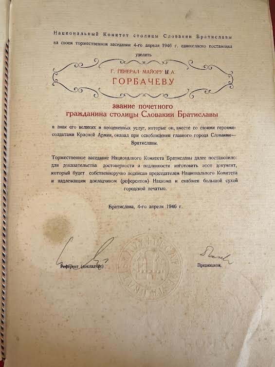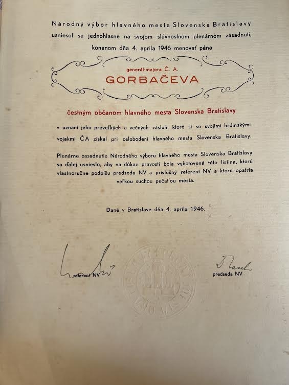 Diplomă acordată Generalui-Maior Gorbaciov I.A., în calitate de cetățean de onoare a capitalei Slovaciei - Bratislava, pentru merite desosebite, care a eliberat capitala Slovaciei - Bratislava, alături de colegii lui din Armata Roșie
