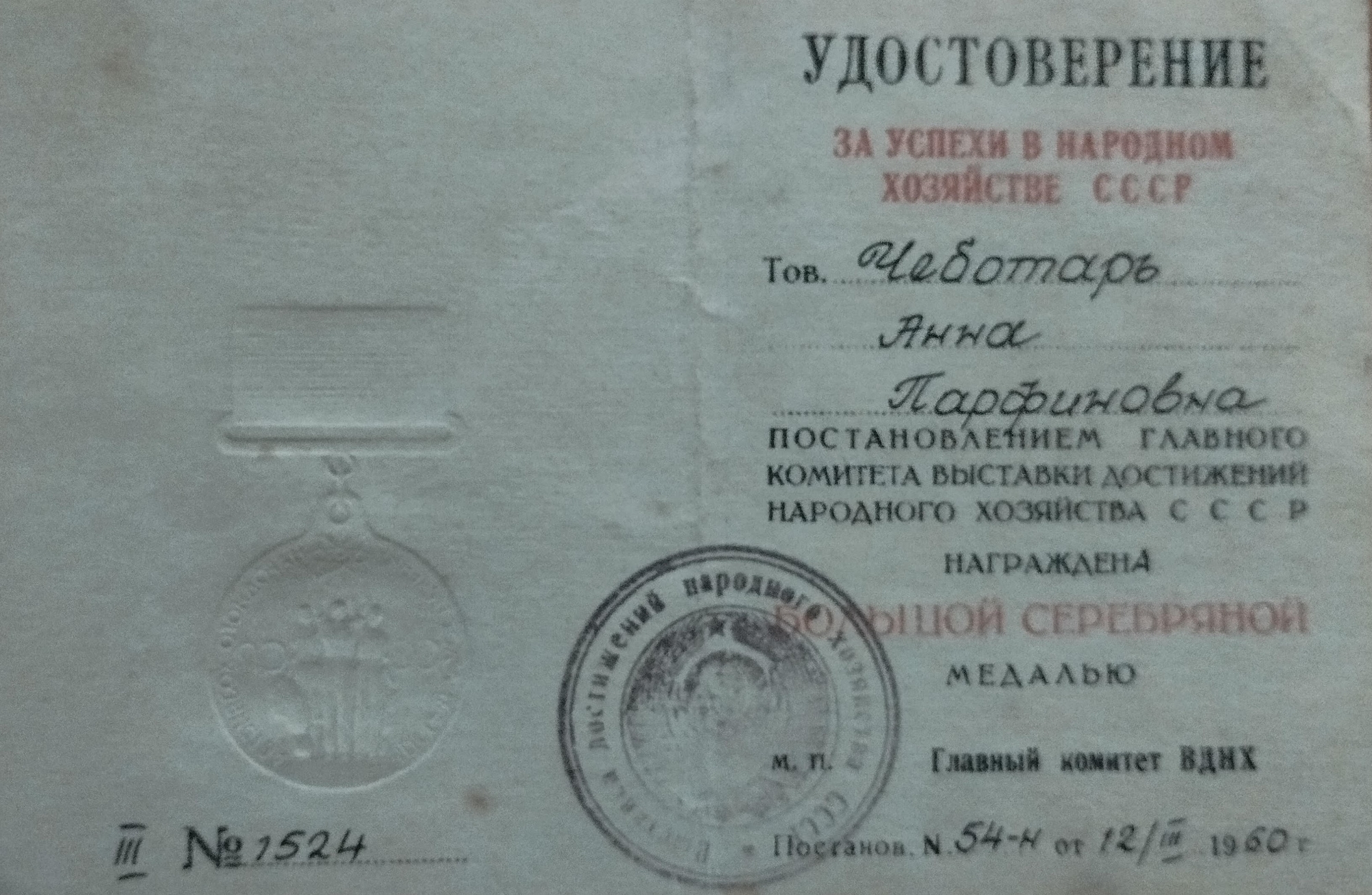 Legitimația nr.1524 a lui Cebotari Olesea pentru medalia mare de argint din 12.03.1960
