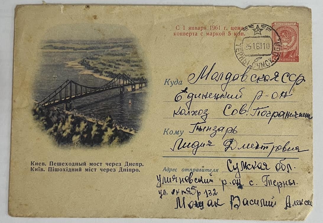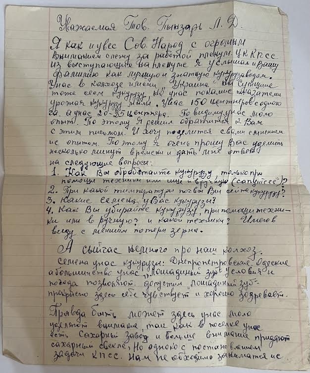Scrisoare către Lidia Pînzari, r. Edineț, colhozul ”Garda de frontieră sovietivă”, de la Moșiac Vasilie Alexei, Regunea Sumî (Сумська область), Tерны (Тереньга́), Ульяновский район, care menționează despre doamna Lidia drept cea mai bună și cunoscută dintre cultivatori de porumb