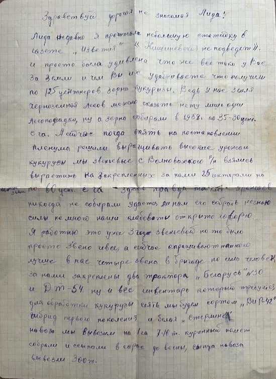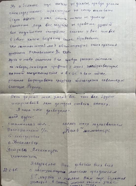 Scrisoare către Pînzari Lidia, cu adresa în r. Edineț, s. Brînzeni, colhozul ”Garda de frontieră sovietică”, de la Petrova Alexandra Ilie, din Сталинская область, Донецк, r.Volnovaha, s. Nicolaevca, care relatează despre roadele porumbului
