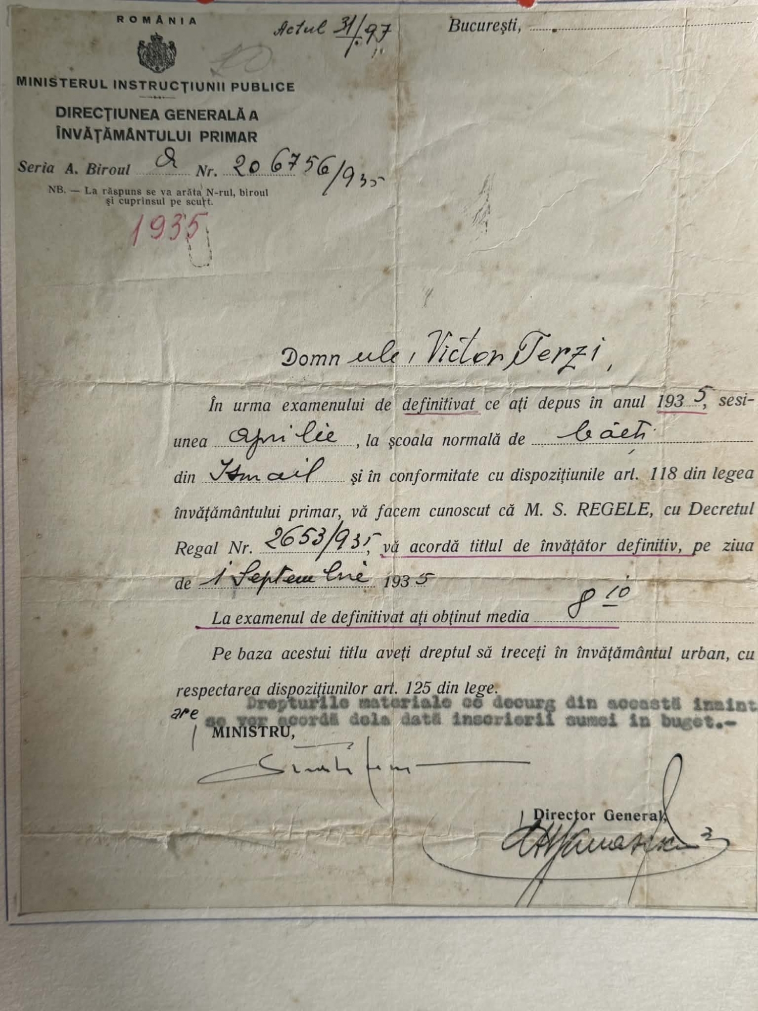 Documentul atestă promovarea examenului de definitivare în învățământ de către Victor Terzi, susținut în sesiunea aprilie 1935, la școala normală din Ismail. În baza Decretului Regal nr. 2653/1935, emis de M.S. Regele, i se acordă titlul de „învățător definitiv” începând cu 1 septembrie 1935. Se menționează media obținută la examen: 8,10. Actul conferă dreptul de a activa în învățământul urban, conform prevederilor legale în vigoare (art. 118 și 125 din legea învățământului primar).