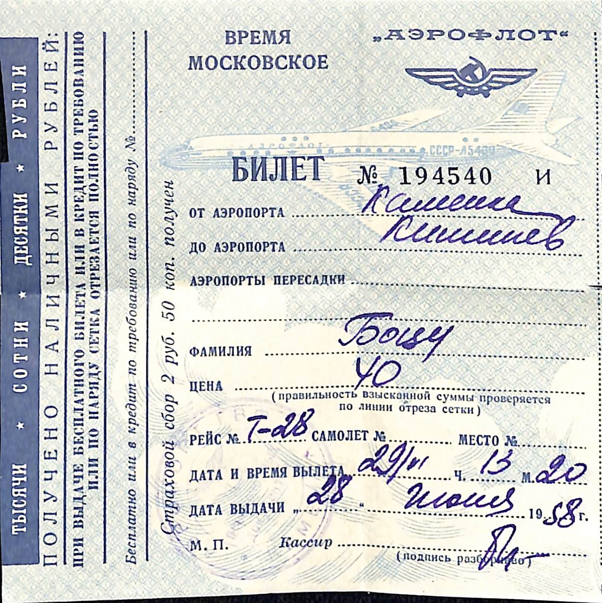 Boțu, Pavel. Bilet de călătorie Nr. 194540: de la Aeroportul Camenca până la Aeroportul Chișinău. Pe recto: pe un fondal în culoare turcoaz, sus colț dreapta este scris: „АЭРОФЛОТ”, iar mai jos este sigla instituției, în dreapta este scris: „Московское время”. Biletul de călătorie este eliberat pe numele lui Boțu Pavel. Documentul este imprimat pe un formular-tip scris în limba rusă și completat cu scris olograf cu stilou în culoare albastră. Este indicat prețul biletului de călătorie, data și ora zborului cu avionul, precum și data eliberării biletului: 28 iunie 1958. Este semnătura și aplicată ștampila. Pe verso: este inserat Extrasul din Regulile pentru călători. Jos este indicată tipografia și anul 1957.