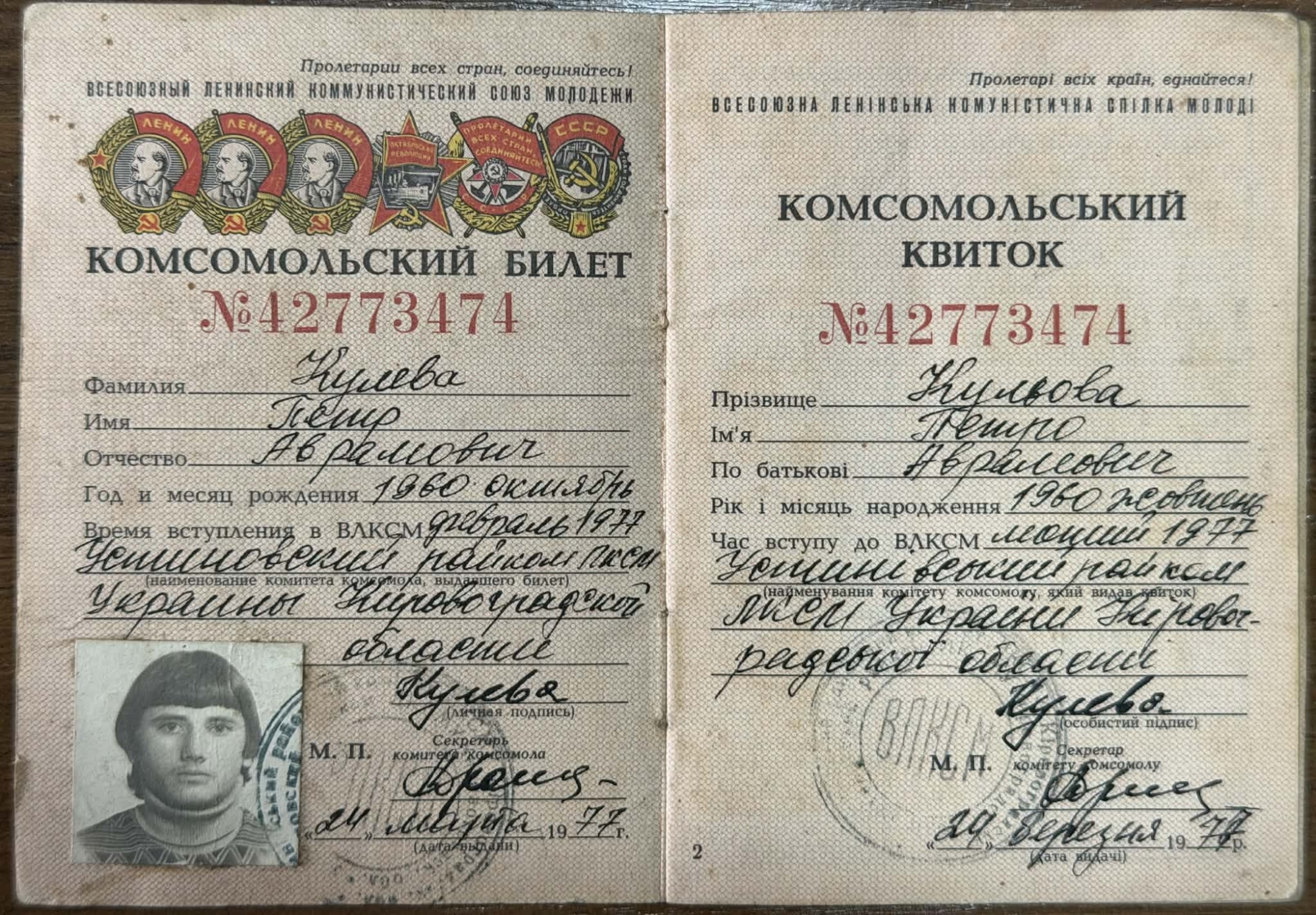 Documentul este un Bilet de Membru Komsomol (Uniunea Tineretului Comunist din fosta Uniune Sovietică), eliberat în anul 1977. Acesta este un document bilingv, scris în limbile rusă (partea stângă) și ucraineană (partea dreaptă). Detaliile identificate în document se referă la: informațiile personale despre membru și detalii despre Aderare și Emitere.
