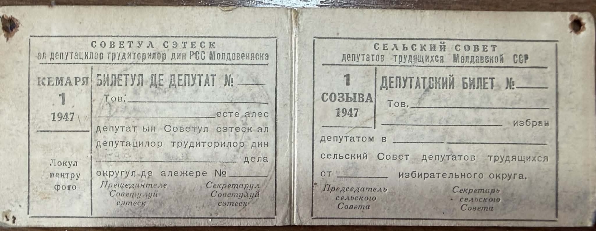 Documentul reprezintă Biletul de deputat (Ajder Feodor) din fosta Republică Sovietică Socialistă Moldovenească (RSSM), prezentat sub formă de carnet pliabil, de culoare gri, cu file interioare din hârtie îngălbenită. Documentul conține informații în ambele limbi oficiale ale RSSM din acea perioadă- rusă și grafie latină. Partea stângă a documentului include un spațiu marcat pentru fotografie (care lipsește) și un chenar ștampilat pentru fixarea acesteia, indicând că documentul necesita o poză a titularului; numărul legitimației, numele aparținatorului, funcția și locația. Sunt prezente spații pentru: Semnătura personală a deputatului, Președintele comitetului executiv și Secretarul comitetului executiv, însoțite de semnături olografe. Partea dreată a documentului conține aceeași informație, scrisă în limba rusă.