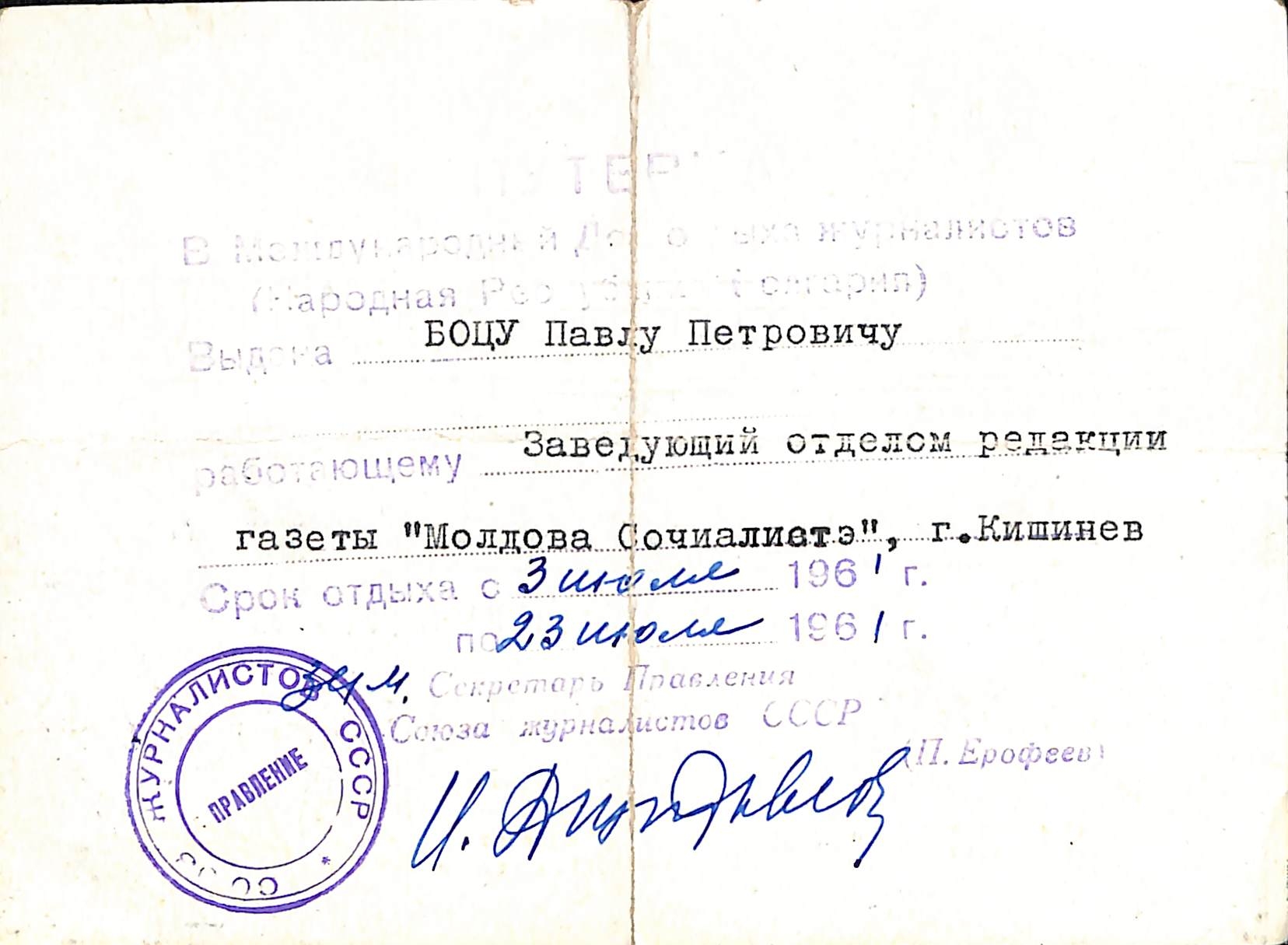 Boțu, Pavel. Carte de sejur Nr.01038, orașul Varna, Republica Populară Bulgaria. Uniunea Jurnaliștilor din URSS. Pe recto: pe un fondal în culorile albastru, alb și galben este scris după cum urmează: „Международен Дом Журналистите. Maison Internationale des Journalistes. Карта за престой. Варна. НРБ.\Varna. RPB. Carte de sejour. Директор\Directeur.” Este semnătura și aplicată ștampila. Pe verso: „Путёвка в Международный Дом отдыха журналистов (Народная Республика Болгария) Выдана БОЦУ Павлу Петровичу работающему Заведующий отделом редакции газеты „Moлдова Сочиалистэ”, г. Кишинёв. Срок отдыха с 3 июля 1961 г. По 23 июля 1961 г. Зам. Секретарь Правления Союза Журналистов СССР: П. Ерофеев.” Este semnătura olograf cu stilou în cerneală albastră și aplicată ștampila cu înscrisul: „Правление Союза Журналистов СССР”.