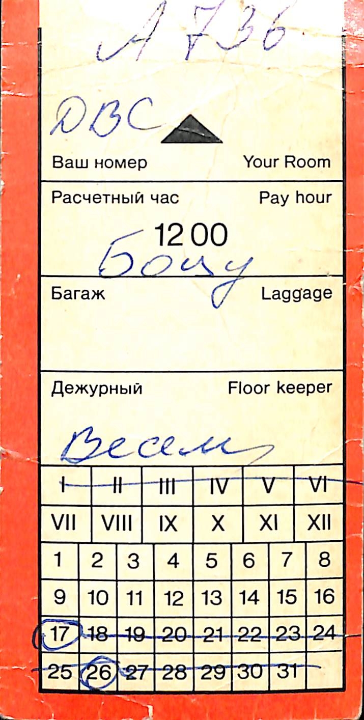 Boțu, Pavel. Carte de sejur. Orașul Moscova, Hotelul Moscova. Document întocmit pe formular-tip cu text în majoritate tipărit, scris în limba rusă, limba engleză și conține informația pe recto: „Управление высотных домов и гостиниц Мосгорисполкома. Гостиница Москва. Hotel Moskva. Адрес г. Москва, Проспект Маркса, 7. Телефон Справ бюро 2921000. МЕТРО: ст. Проспект Маркса 7 / ст. Пр. Революции”. Pe formular este desenul stilizat în culoare neagră a clădirii hotelului și o cheie simbol. Pe verso este scris în limba rusă și limba engleză: „Ваш номер/Your Room. Расчетный час /Pay hour 12 00. BOȚU. Багаж /Laggage. / Дежурный / Floor keeper”. Documentul este completat cu scris olograf cu stilou în culoare albastră. Marginile documentului sunt în culoare roșie.
