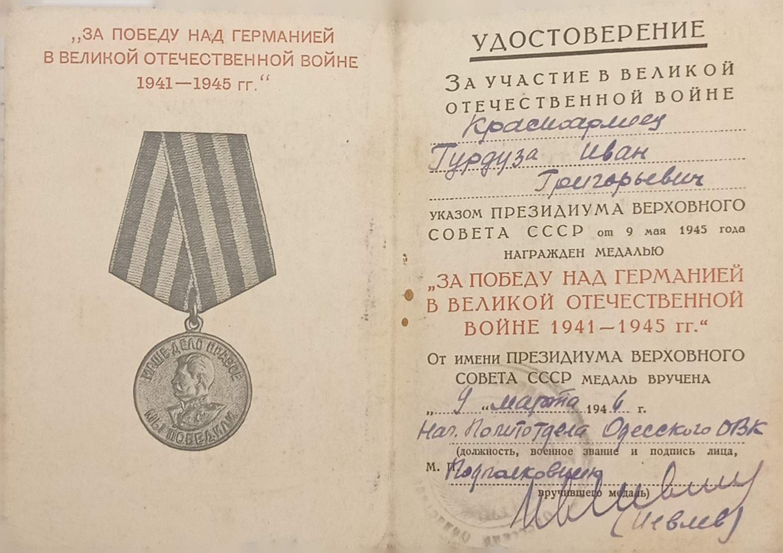 Legitemația pentru medalia „Pentru Victoria asupra Germaniei în Marele Război pentru Apărarea Patriei 1941-1945”, Gurduza Ivan, cu ștampilă și semnătură, emisă de Prezidiul Sovietului Suprem al URSS