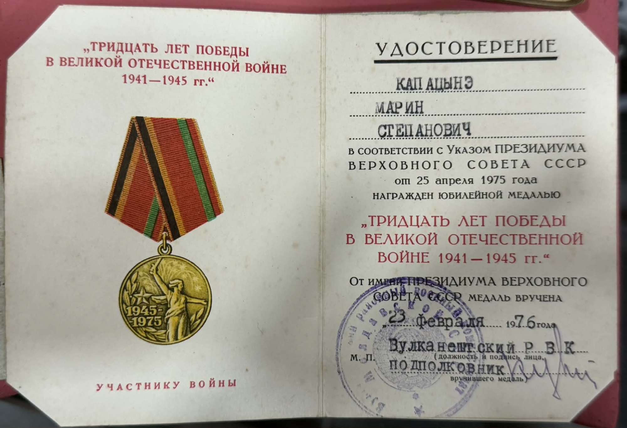 Documentul certifică faptul că titularul-Căpățînă Marin Stepan, a fost decorat, conform Decretului Prezidiului Sovietului Suprem al U.R.S.S. din 25 aprilie 1975, cu medalia jubiliară „Treizeci de ani ai Victoriei în Marele Război pentru Apărarea Patriei 1941–1945”.