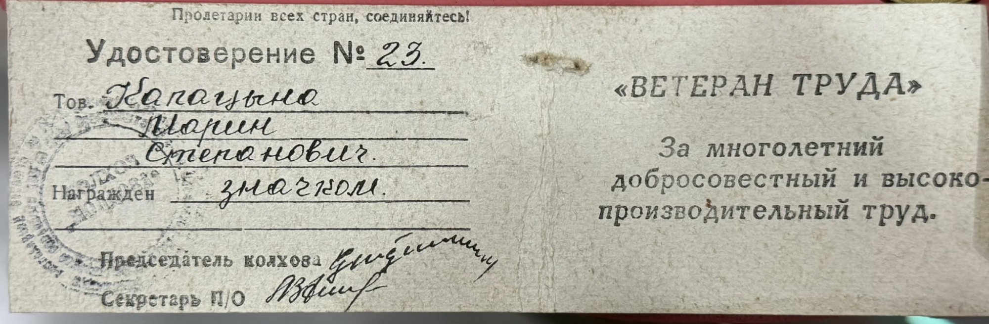Pe pagina stângă este menționat: „Удостоверение № 23”, urmat de numele titularului, completat manuscris-Căpățînă Marin St. Textul indică faptul că acesta este „награжден знаком” (decorat cu insignă).