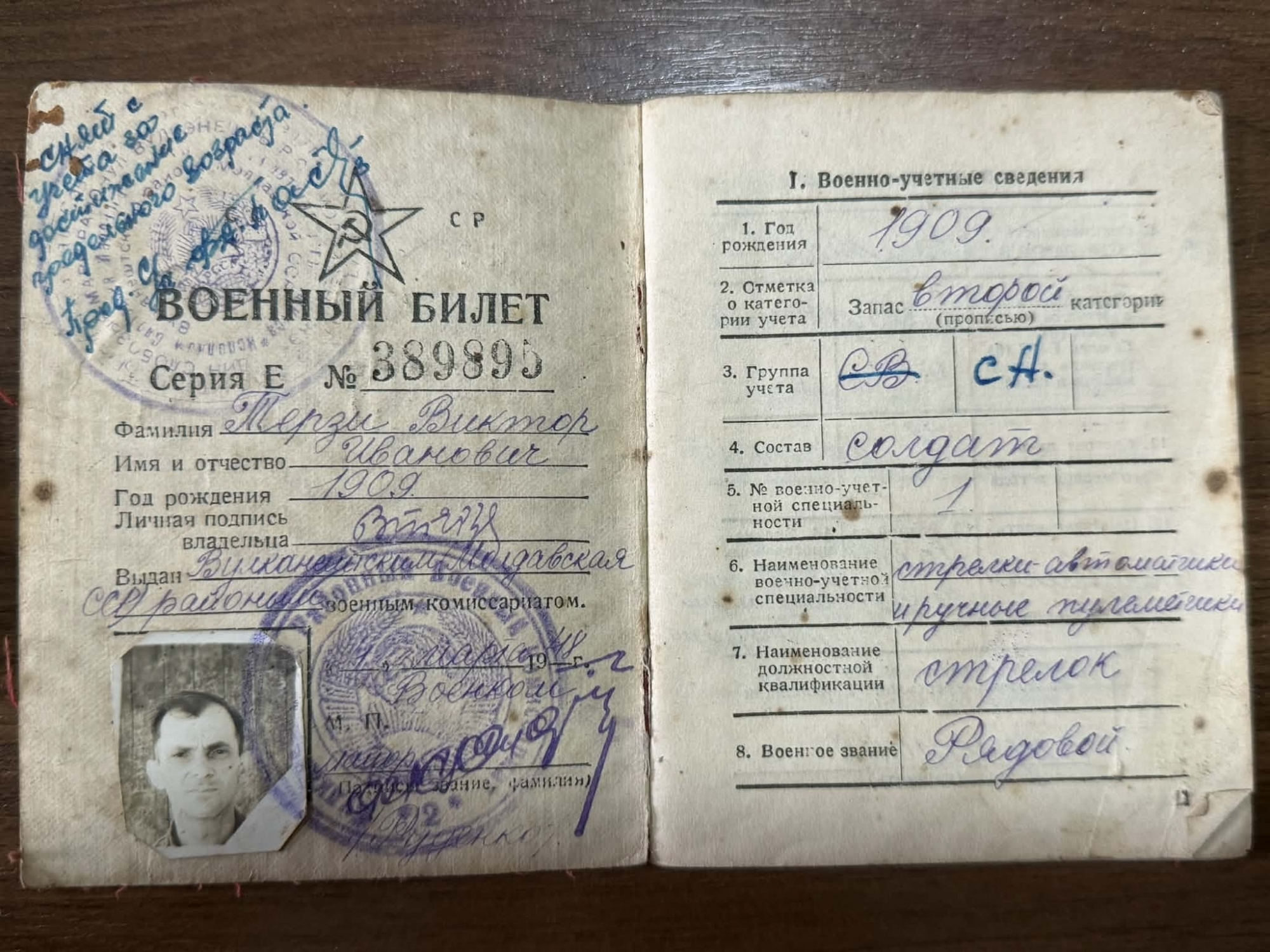 Document oficial de identitate militară, tip carnet, redactat în limba rusă, cu copertă interioară tipărită și completări manuscrise cu cerneală albastră și violet. Pe prima pagină este imprimată steaua cu secera și ciocanul – însemn militar sovietic – și titlul „Военный билет”. Date înscrise: Nume, prenume, patronimic: Terzi Victor Iv.; anul nașterii: 1909; categoria de evidență: rezervă, categoria a II-a; grupa de evidență: SA; componență: soldat; specialitate militară: trăgător automatist (armament individual); funcție: trăgător; grad militar: soldat (Рядовой) Documentul conține fotografia titularului (alb-negru, tip legitimație), aplicată pe pagina interioară stângă și parțial suprapusă de ștampila rotundă a comisariatului militar. Sunt prezente ștampile oficiale, semnături olografe și mențiuni ulterioare privind evidența militară. Este un document reprezentativ pentru sistemul de evidență militară al URSS în perioada postbelică. Oferă informații privind organizarea administrativ-militară, structura rezervelor și specializările militare din RSS Moldovenească, constituind o sursă relevantă pentru cercetarea istoriei militare și sociale a secolului XX.