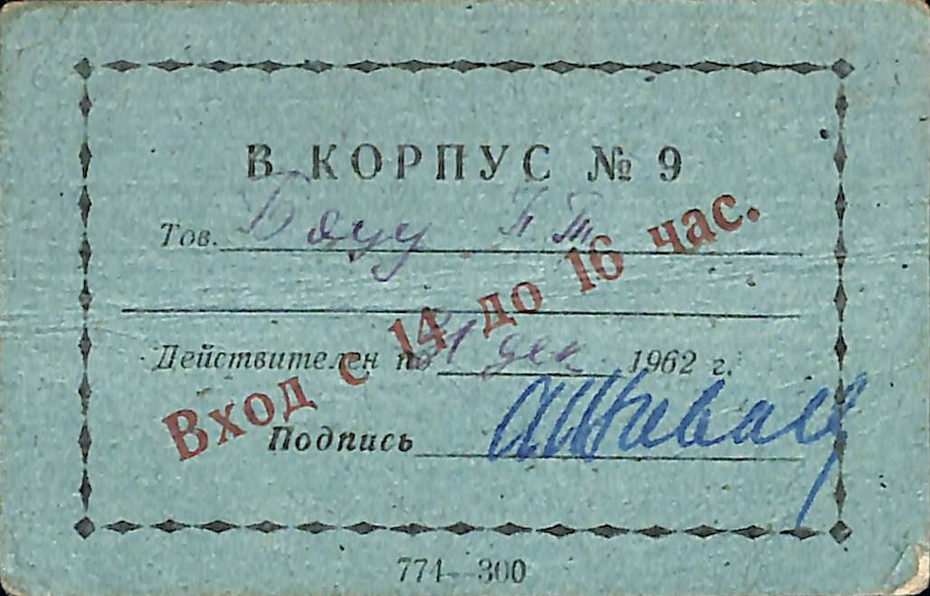 Boțu, Pavel. Permis. Documentul este imprimat pe carton presat în culoare turcoaz și completat cu scris olograf scris cu stilou în culoare albastru-violet. Textul este imprimat în culorile roșu și negru în limba rusă după cum urmează: „Вход с 14 до 16 час. В КОРПУС № 9. Тов. Боцу П. П. Действителен по 1 дек. 1962 г. Подпись”. Este semnătura olograf cu stilou în cerneală albastră. Textul este încadrat într-un chenar în culoare neagră. Pe verso: fondal în culoare turcoaz, nu conține informații.