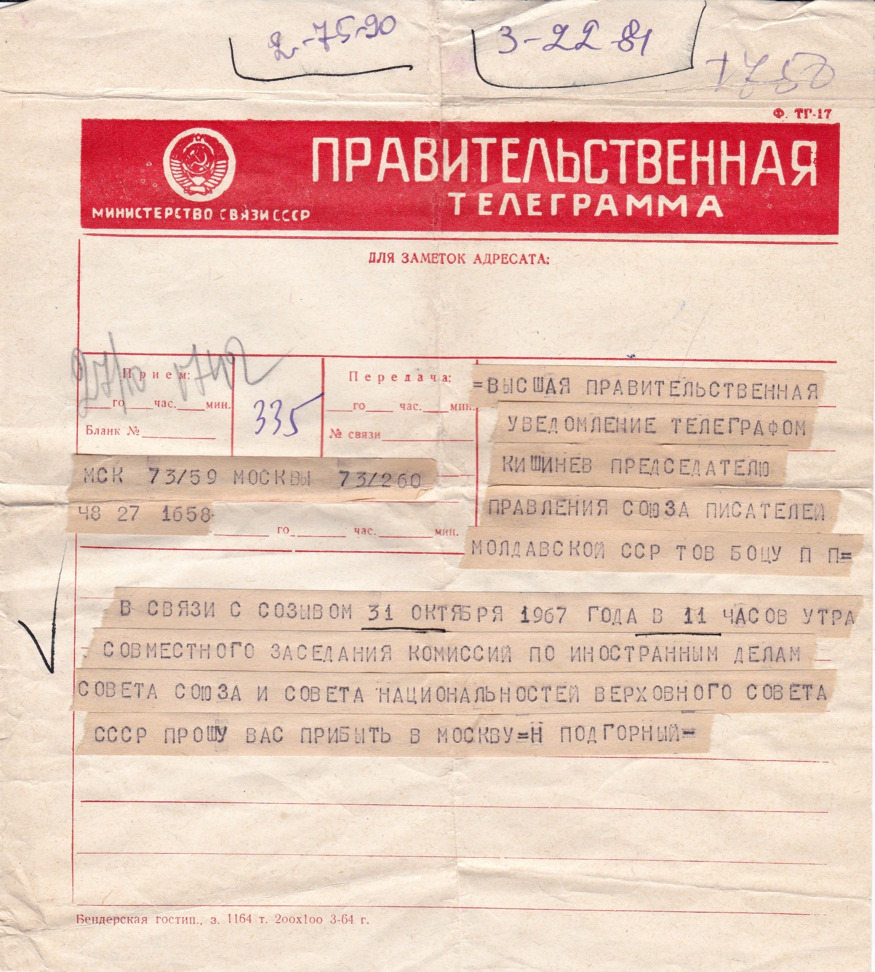 Boțu, Pavel. Document. Telegramă Guvernamentală. Ministerul Telecomunicațiilor din URSS. Documentul este adresat scriitorului Boțu Pavel Petrovici, Președinte al Uniunii Scriitorilor din RSS Moldovenească. Documentul este dactilografiat pe un formular-tip, scris în limba rusă și conține informația după cum urmează: «…Высшая Правительственная Уведомление Телеграфом. Кишинев. Председателью Правления Союза Писателей Молдавской СССР Тов. Боцу П. П. … В связи с Созывом 31 октября 1967 года в 11 часов утра совместного заседания Комисcий по Иностранным Делам Совета Союза и Совета Национальностей Верховного Совета СССР прошу Вас прибыть в Москву. Н. Подгорный.» Documentul este inserat pe hârtie tipizată, textul telegrafic - aplicat, sus colț stânga este imprimată stema URSS în culoare roșie, iar mai jos este scris: „Министерство Связи СССР”. Pe fondal în culoare roșie este scris: „Правительственная Телеграмма”. Pe document sunt înscrise olograf cu stilou în culoare albastră și creion negru - numere de telefoane, cifre etc. Documentul este pe o pagină de hârtie fragilă, îngălbenită, margini deteriorate.