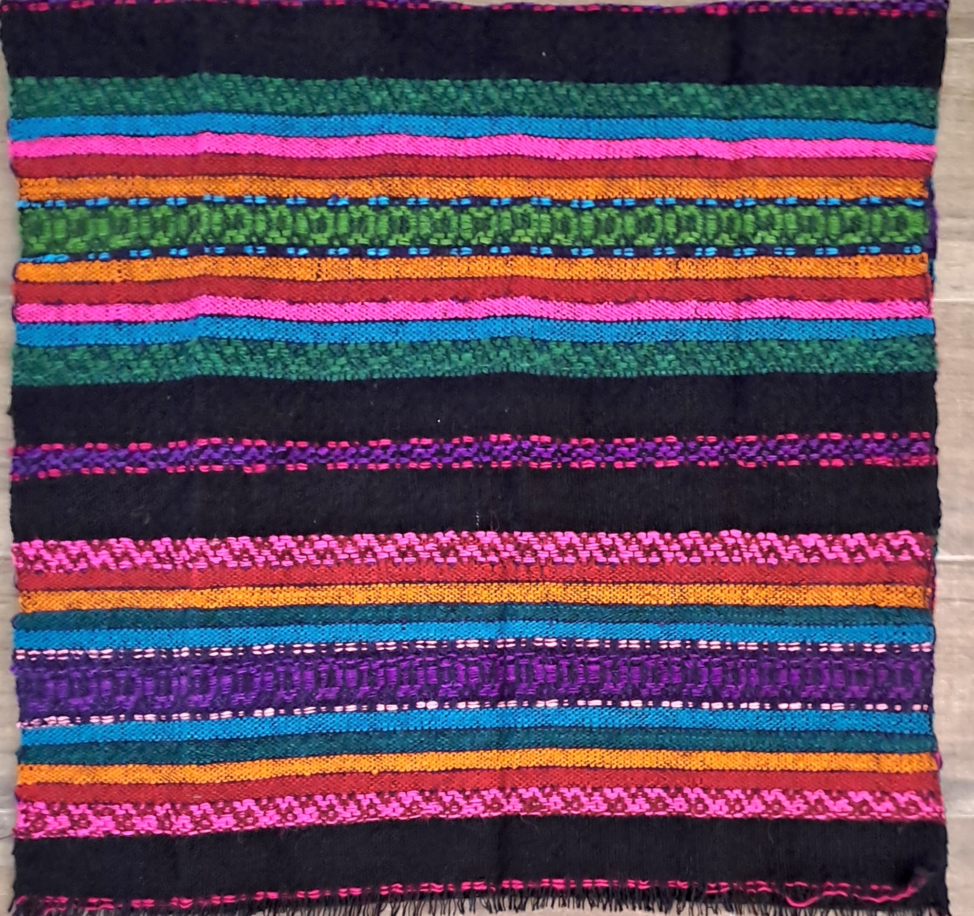 Piesă de formă dreptunghiulară, țesut manual în 4 ițe la războiul de țesut orizontal pe urzeală de bumbac de culoare neagră, bătut cu lână, cu două fețe. Decorul ornamental format din registre colorate , formate din linii cu motive geometrice pe toată suprafața piesei. Cromatică; negru, nuanțe de verde, roș, roz, oranj, galben, violet, albastru.