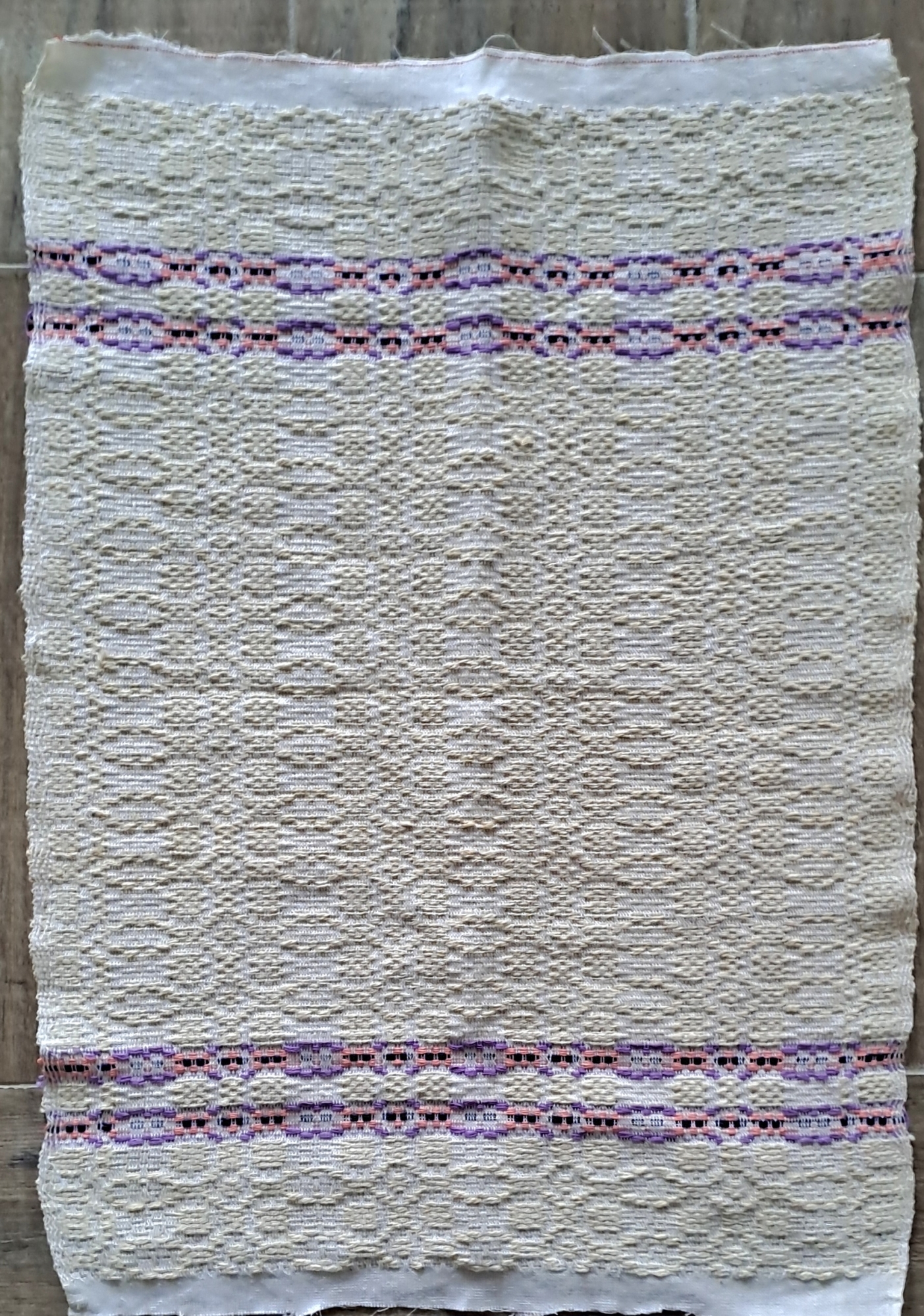 Piesă dreptunghiulară țesută în stative, în 4 ițe pe urzeală de bumbac, bătut cu fir de cânipă. Pe toată suprafața ornament geometrizant de culoare galbenă. La capetele laterale registre cu ornament geometrizant. Cromatică: violet, oranj, negru.