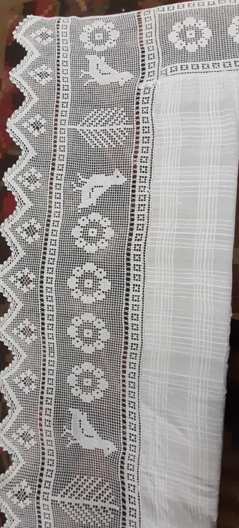 Cuvertură confecționată dintr-un lat de pânză țesută în cadril cu registre ver-tical și orizontal diferite de tiriplic,croșetată la margini cu dantelă în tehnica filet; motive:la margini-motiv geomorf,plasă,motiv floral;la o coastă:motiv geomorf, plasă, motiv floral,avimorf;dantelă în colțuri:motiv fitomorf(struguri). Marginea colţului este