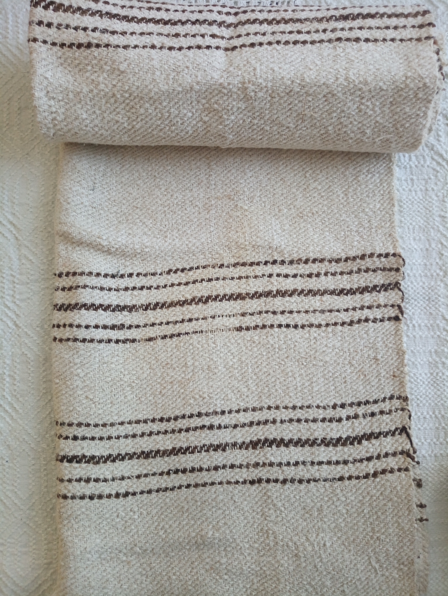 Țesut în război orizontal (stative), forma dreptunghiulară, cu două fețe, urzeala ață, băteala cânepă. Este țesut în pânză monocrom, culoarea cânepei naturală, cu registre din fire maro întunecat spre capetele țolului. La capete tivit. Se folosea în treburile casnice. Cromatica: bej (alb-gălbui), maro întunecat.