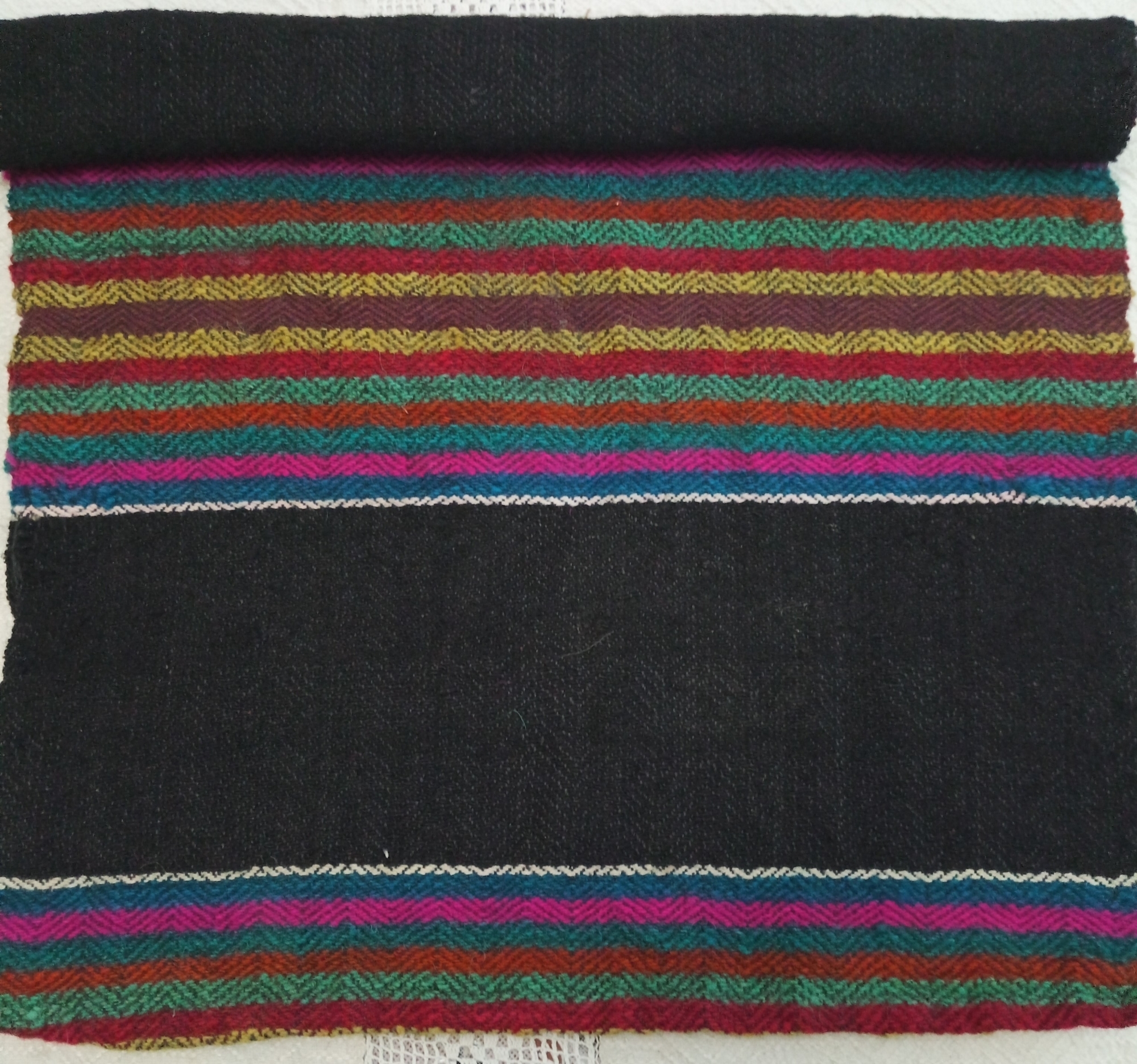 Țesut în război orizontal (stative), forma dreptunghiulară, cu două fețe, urzeala ață, băteala lână. Este țesut în scaune late din lână de culoare neagră, de ambele părți fiind țesut câte un fir de culoare albă și cu scaune late din două registre de dungi policrome de culori diferite, care la mijloc au o culoare comună - bordo. La capete tivit. Câștigat la înmormântarea răposatului Mihail Tcaci. Se folosea ca așternut pe scaune, pe jos la podea. Cromatica: verde, galben, albastru în două nuanțe, bordo, roz, maro, negru.