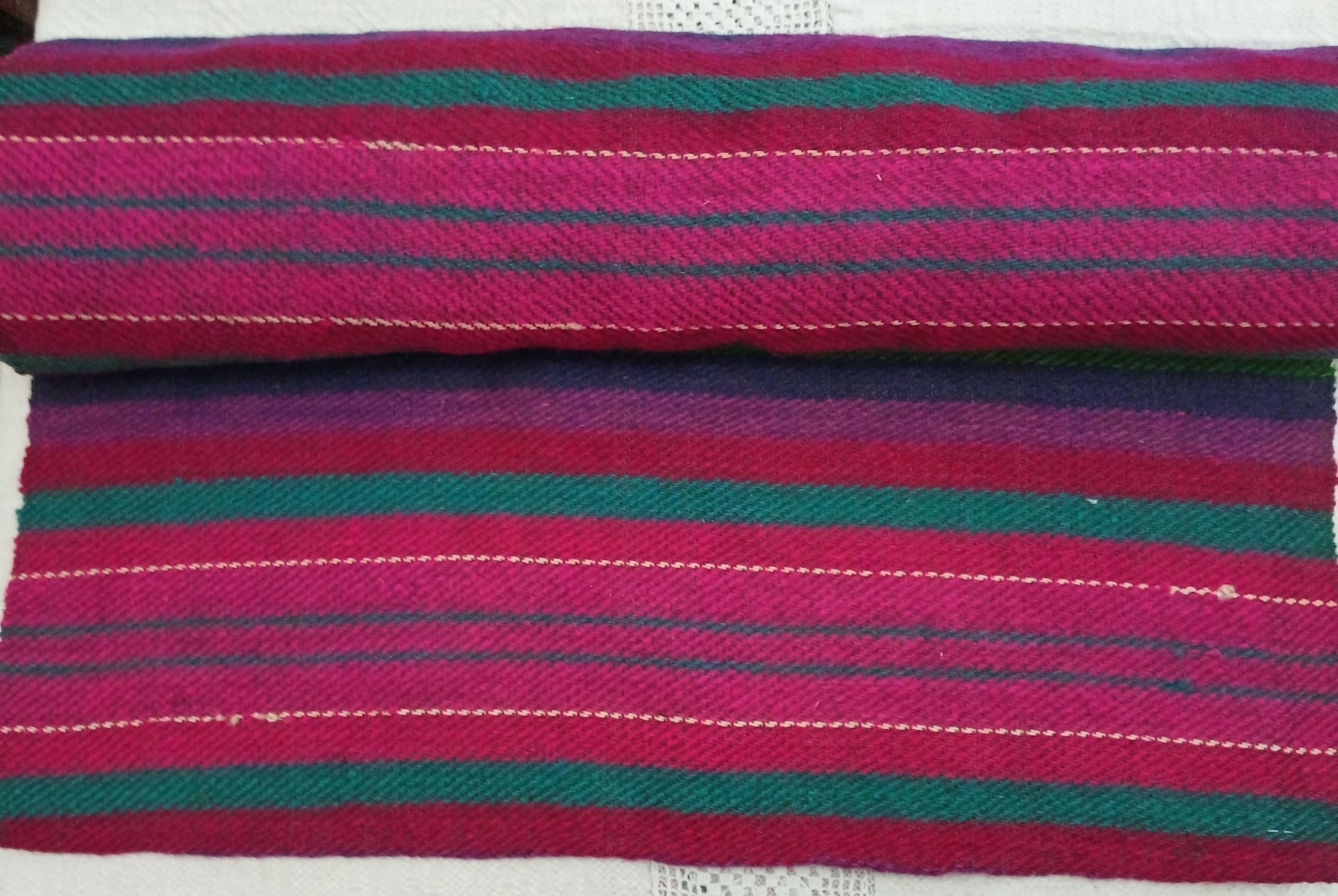 Țesut în război orizontal (stative), forma dreptunghiulară, cu două fețe, urzeala ață, băteala lână. Este țesut în scaune din lână de culoare neagră, la ambele laturi fiind țesut câte un fir de culoare albă și în scaune din două registre cu dungi uniforme, doar cea din mijloc fiind mai lătă, de culoare roz întunecat, fiind întretăiată cu două linii de culoare albă și în interior două linii de culoare albastru, fiind situate paralel la distanțe egale. La capete tivit.