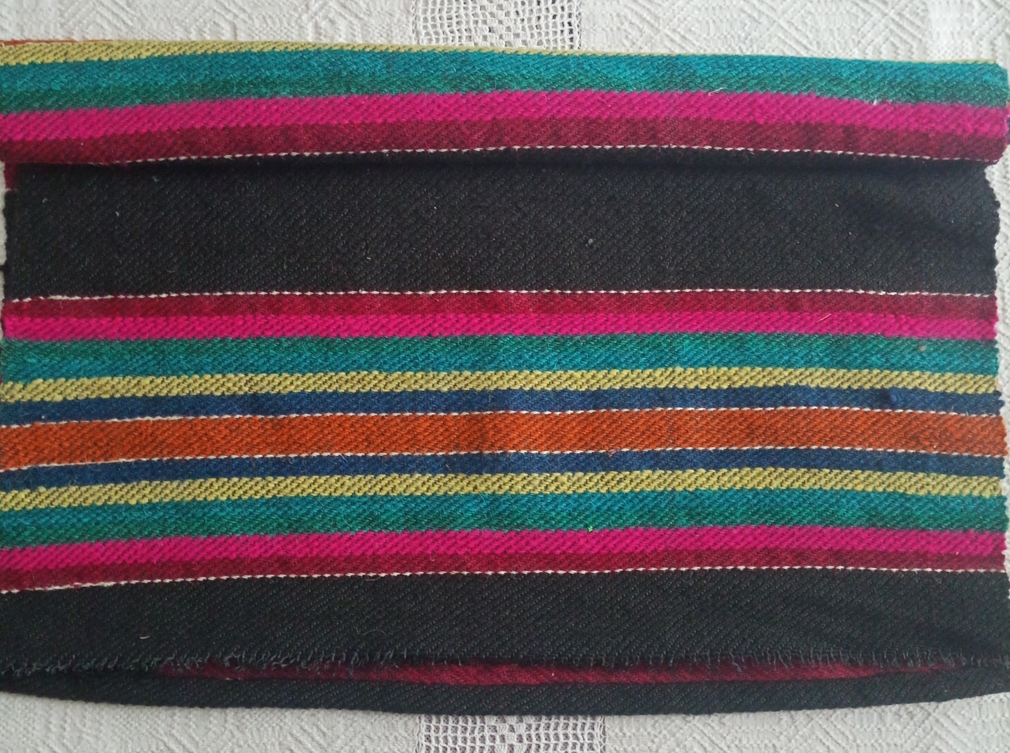 Țesut în război orizontal (stative), forma dreptunghiulară, cu două fețe, urzeala ață, băteala lână. Este țesut în scaune din lână de culoare neagră, la ambele laturi fiind țesut câte un fir de culoare albă și în scaune din două registre cu dungi uniforme, în mijloc una de culoare maro fiind comună ambelor registre și este împrejmuită de ambele părți cu un fir de culoare albă. La capete franjuri.