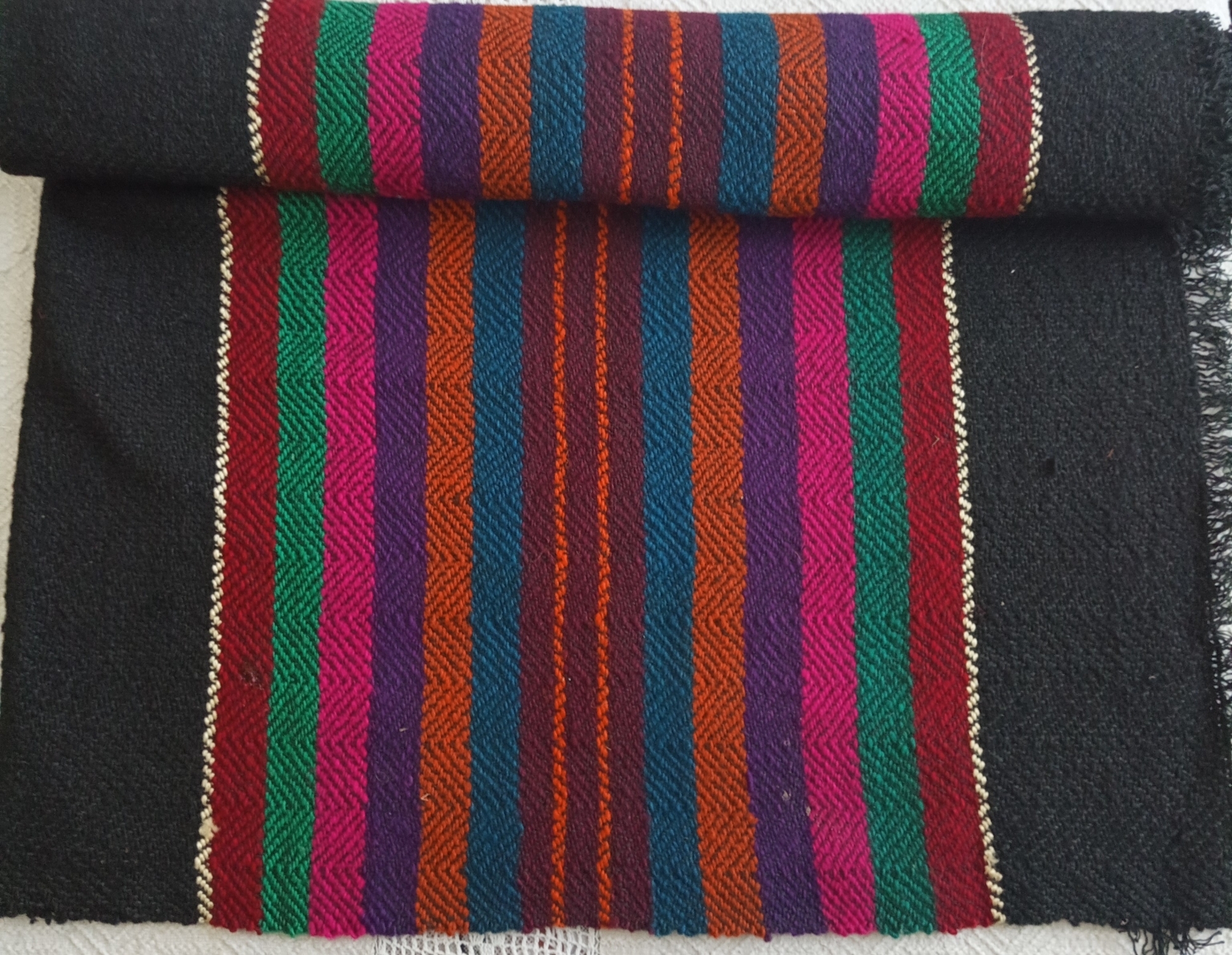 Țesut în război orizontal (stative), forma dreptunghiulară, cu două fețe, urzeala ață, băteala lână. Este țesut în scaune din lână de culoare neagră, la ambele laturi fiind țesut câte un fir de culoare albă și în scaune din două registre cu dungi uniforme, doar cea din mijloc de culoare bordo întunecat fiind mai lătuță, separată cu două fire de culoare portocalie. La capete franjuri.