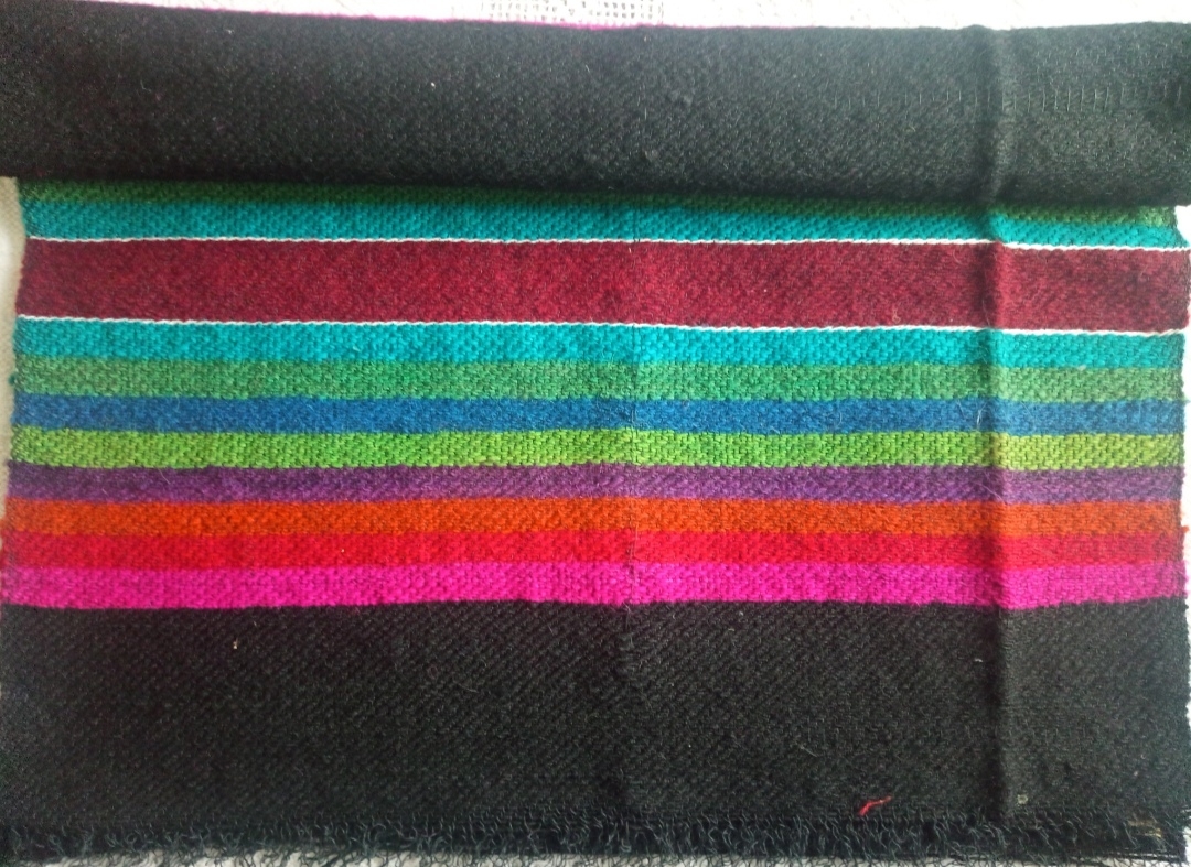 Țesut în război orizontal (stative), forma dreptunghiulară, cu două fețe, urzeala ață, băteala lână. Este țesut în scaune din lână de culoare neagră și în scaune din două registre cu dungi uniforme policrome, doar cea din mijloc de culoare bordo fiind mai lătuță. La capete franjuri.