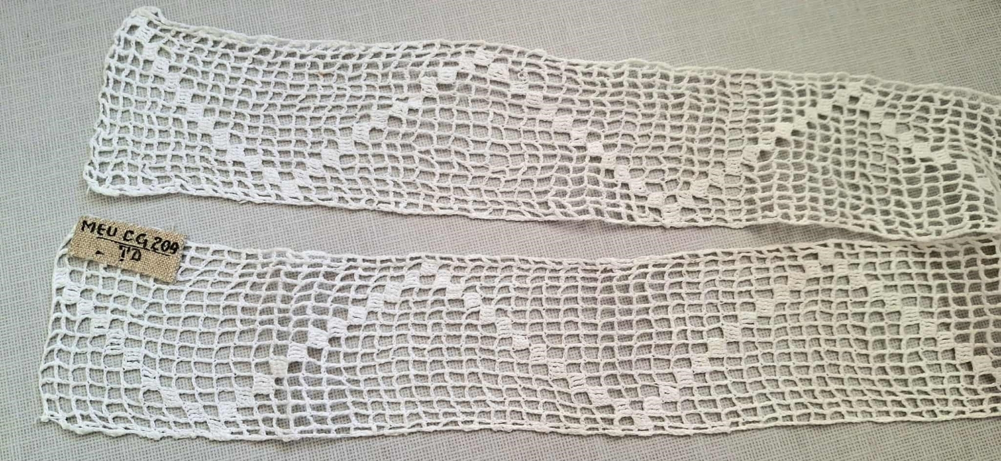 Dantelă croșetată manual cu ață ață albă de bumbac. Are ornament geometric care reprezintă un zig-zag, restul spațiului este umplut cu mici pătrățele ce se repetă. Folosită ca element decorativ la îmbrăcăminte sau la textile de interior.