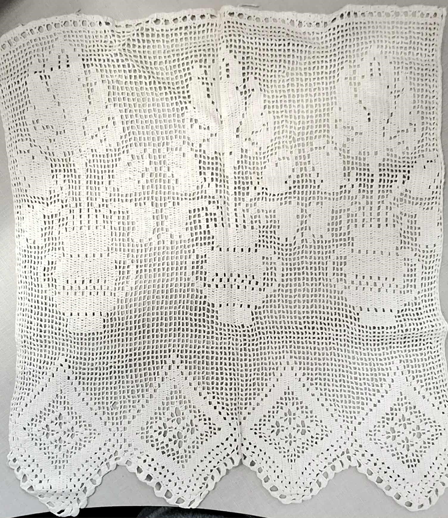 Dantelă pentru prosop sau perdeluță la fereastră croșetată manual cu ață albă din bumbac. Ornament vegetal și geometric. Linia de sus este o fâșie cu găuri. Partea centrală are 3 vazoane cu flori (un trandafir cu petalele deschise și doi prin părți neînfloriți). În partea de jos sunt 4 romburi iar margina este în zig-zag.