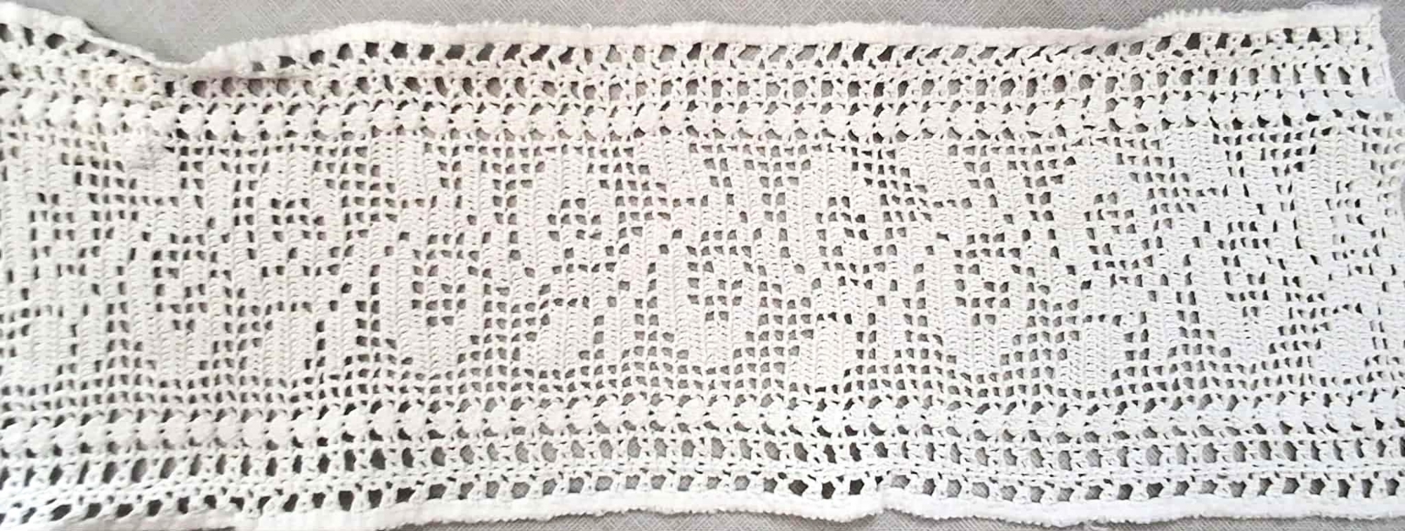 Dantele în număr de două croșetate manual cu fir de ață albă de bumbac. Folosită ca element decorativ la fețe de perne, perdeluțe etc. Pe marginile de sus și de jos are câte trei rânduri subțiri, 2 ,,goale'' și unul mai pronunțat. Pe mijloc un rând lat de ornament vegetal.