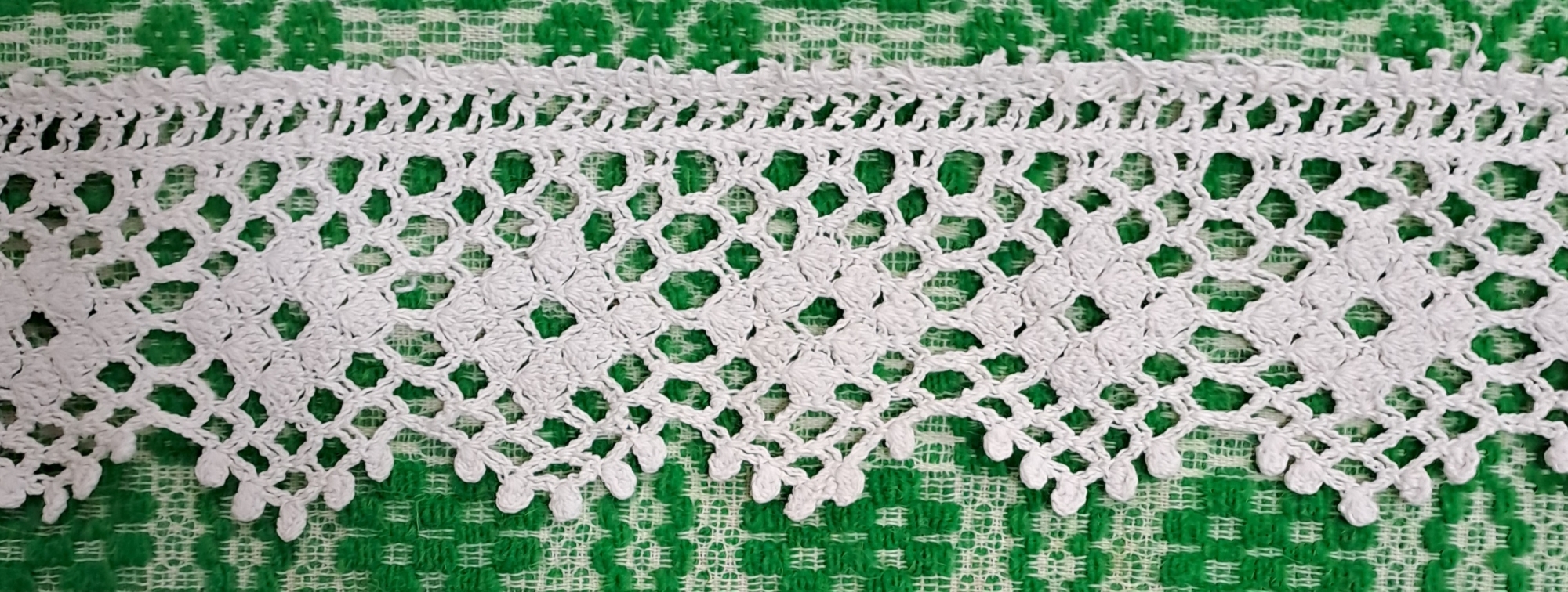Dantelă croșetată din ață de bumbac formă de colț, culoare albă. Ornament geometrizant . Pe margini partea de sus este ornat cu un chenar drept. Partea de jos se compune din colțuri cu ciucuri, care se repetă ritmic. Este folosită ca ornament la piesele textile.
