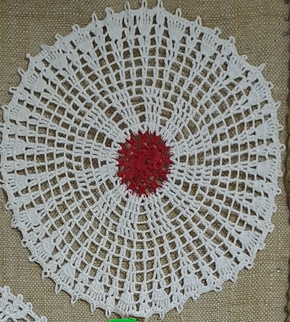 Mileu croșetat din ață de bumbac formă rotundă, culoare albă la mijloc un cerc roșu. Ornament geometrizant, format din elemente geometrice unite între ele. Pe margini este ornat cu un chenar ușor ondulat.