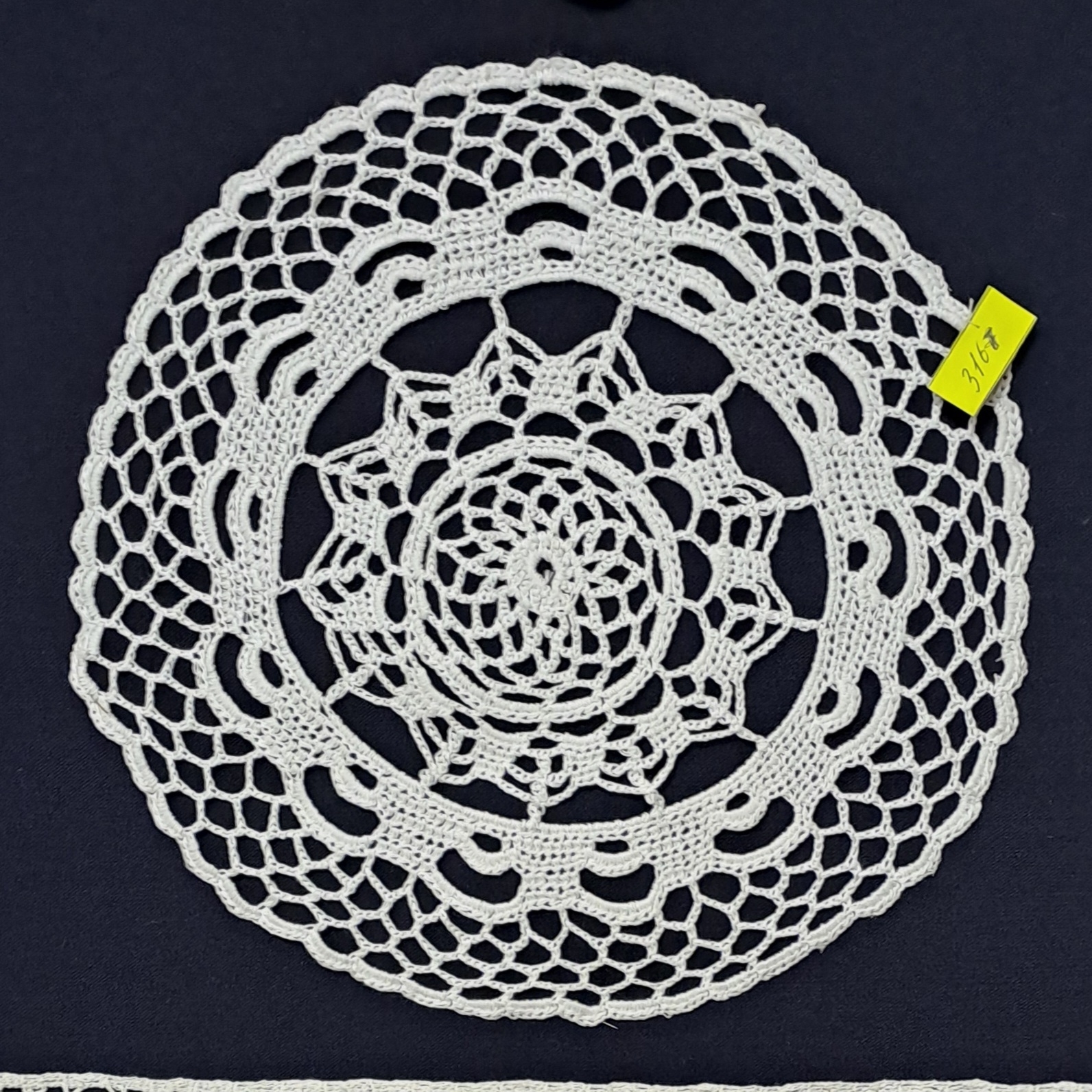 Mileu croșetat din ață de bumbac formă rotundă, culoare albă. Ornament geometrizant, format din elemente geometrice unite între ele. Pe margini este ornat cu un chenar ușor ondulat.