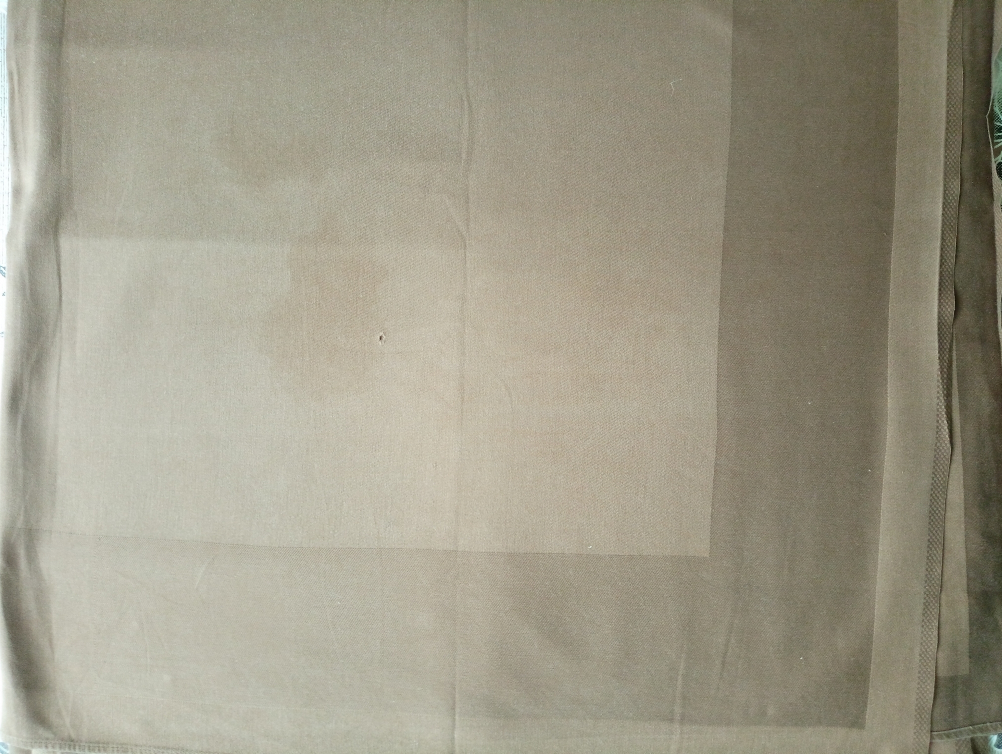 Țesută în condiții de fabrică, forma dreptunghiulară, coton, culoarea cafeniu deschis pe margine, apoi cafeniu întunecat bordura lată pe toate laturile, pe câmpul central un cafeniu mai deschis. La capetele latitudinale tivit.