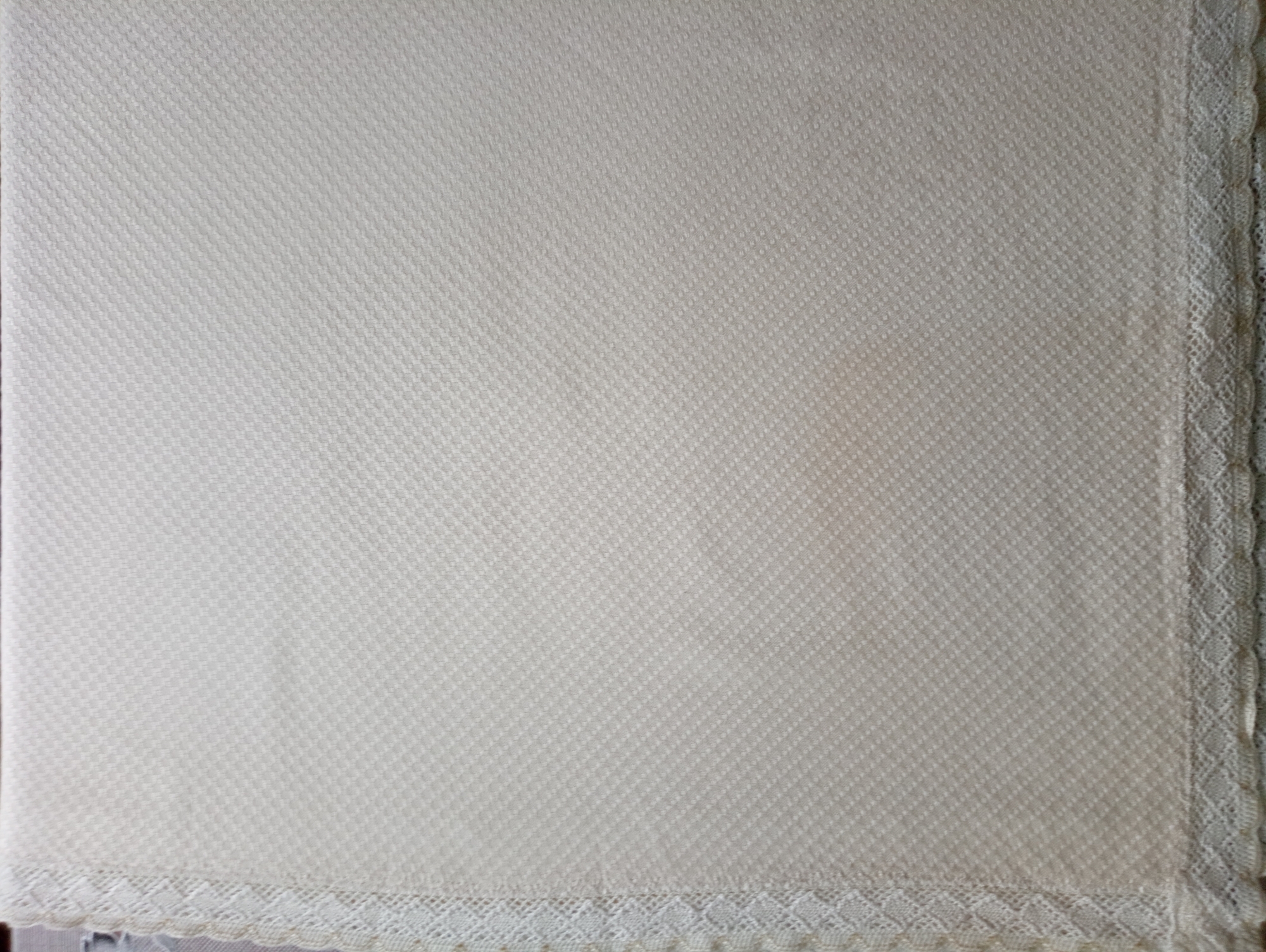 Țesută în condiții de fabrică, forma dreptunghiulară, culoarea alb gălbuie, pe toată suprafața brodat tehnic modelul cruciulița. La capete dantela croșetată cu motivul romb și marginea festonată.