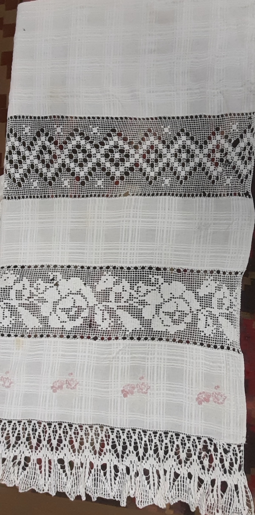 Față de masă din două laturi și o panglică de bumbac vechi,țesută în cadril cu același registru orizontal și vertical,brodată în tehnica cruciuliță obligă la o margine (motiv floral-buchet de trandafiri);cromatica-roșu,verde;croșetată cu dantelă în tehnica filet.Are 2 încheieturi:una-motiv floral,alta-motiv geomorf.Croșeta la o coastă-motiv fitomorf.Marginea de jos este finisată cu registru în formă de semicerc(coada păunului).