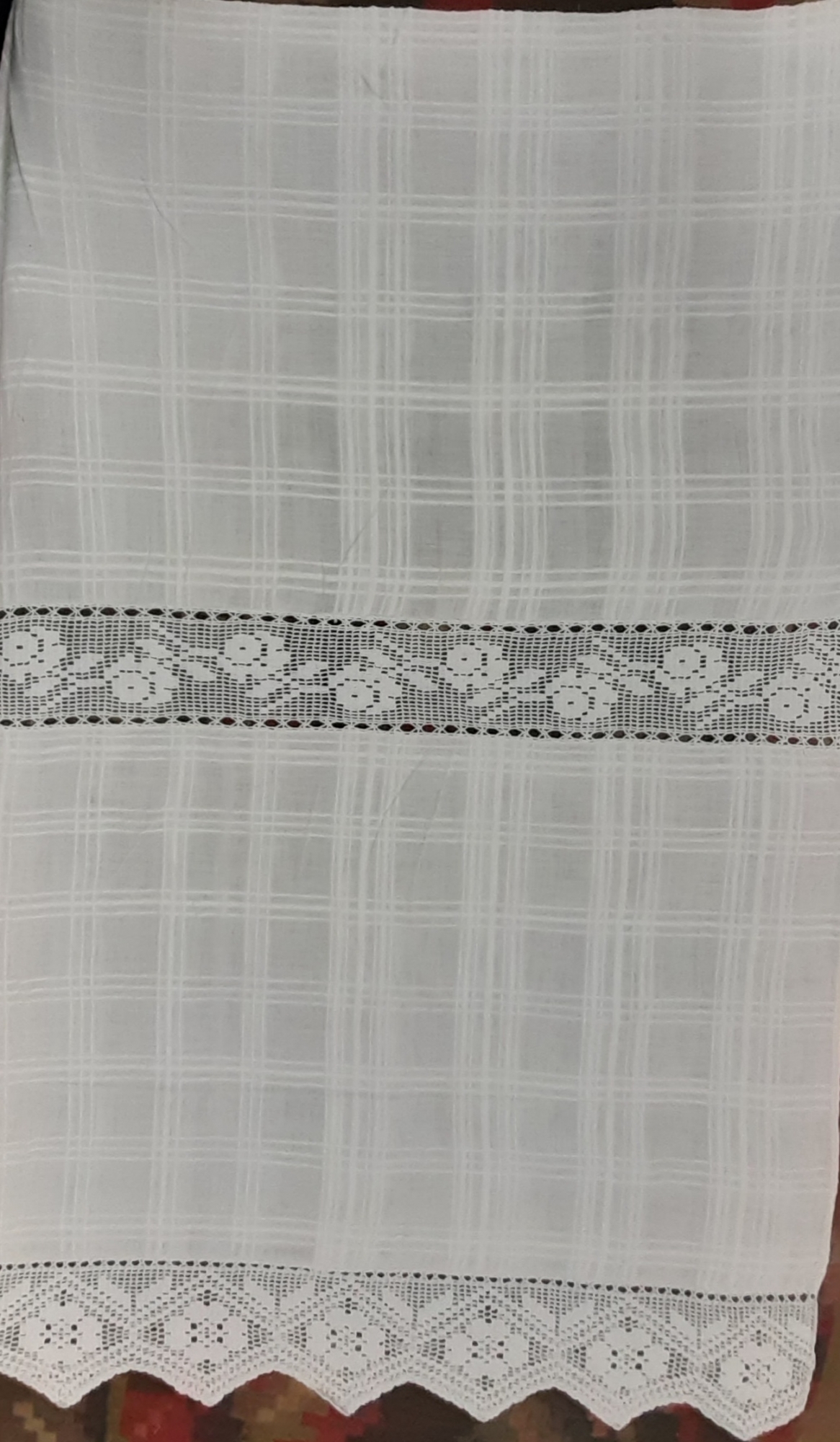 Față de masă din bumbac din două laturi, țesută în cadril cu registru vertical și orizontal diferit,croșetată cu dantelă în tehnica filet cu motive diferire:încheietura-motiv floral(crenguță de trandafir); la trei margini cu dantela în colțuri cu aceleași motive floral și geomorf. La capete-bordura:un rând de stâlpișori consecutivi, uniţi la mijloc câte doi, formând gardul legat sau crucea,panglică din cinci rânduri piciorușe cu un jeteu-motiv floral,plasă din patrate libere, motiv fitomorf în registru primului zigzag- 2 frunze, două zigzaguri din două rânduri de patrate pline,între ele-motiv floral: trandafir;capătul de jos-colțuri, Marginea colţului este festonată printr-un rând de patrate pline.