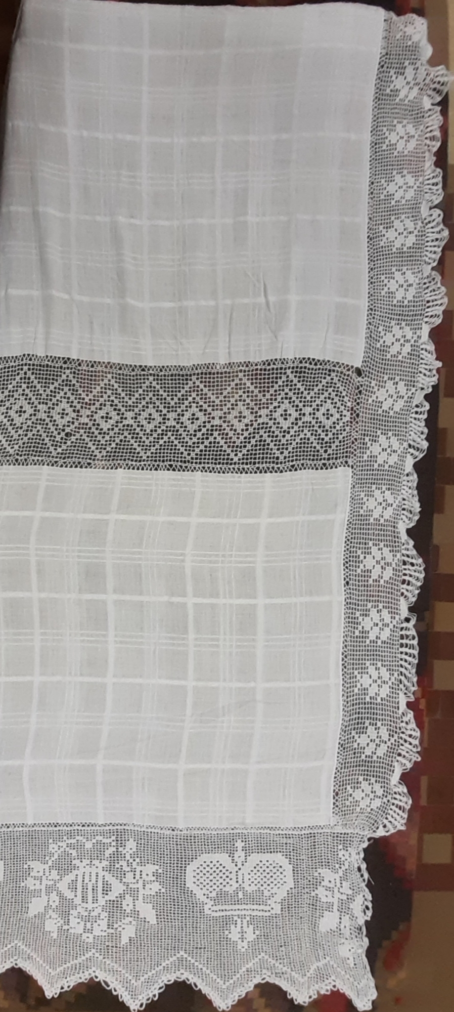 Față de masă de bumbac din două laturi țesută în cadrel cu același registru vertical și orizontal, croșetată cu dantelă în tehnica filet cu motive diferite. Motive: încheietura-motiv geomorf;la capătul principal-motive:floral(cunună) și religios(mitra). Capătul de jos al marginei principale se compune din colţuri,care se repetă ritmic, la distanţe egale.Marginea colţului este decorată cu un rând de pătrăţele pline,rând de trei piciorușe cu jeteu și un semicerc din piciorușe fără jeteu.Capetele la celelalte margini sunt decorate:un registru semicerc de patrate pline realizate în descreștere în șase rânduri de arce sprijinite de trei grupuri de piciorușe cu jeteu.